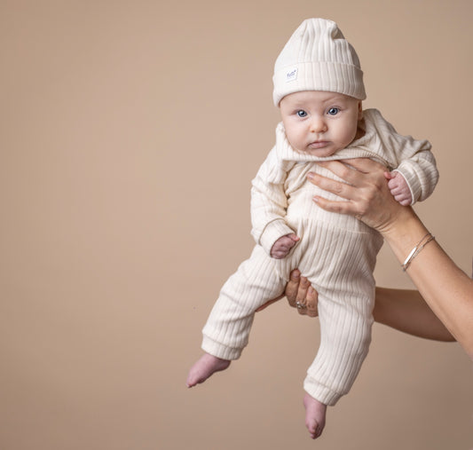 Set primera muda algodón orgánico: body + pantalón + gorrito