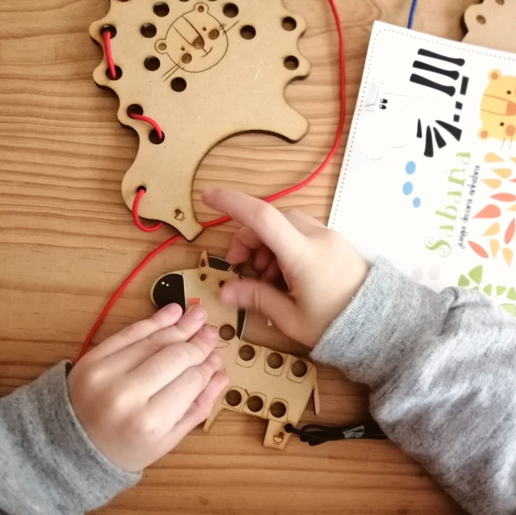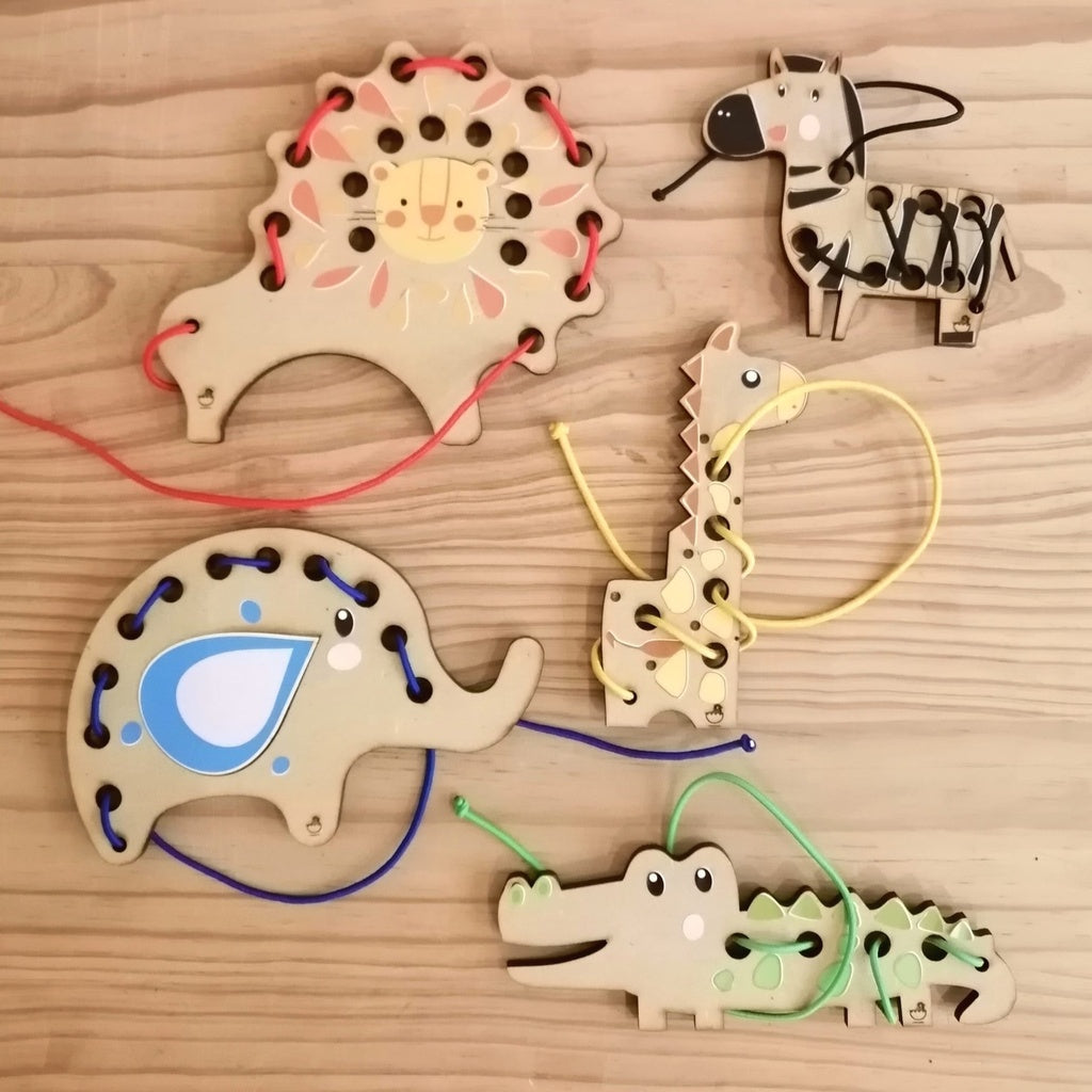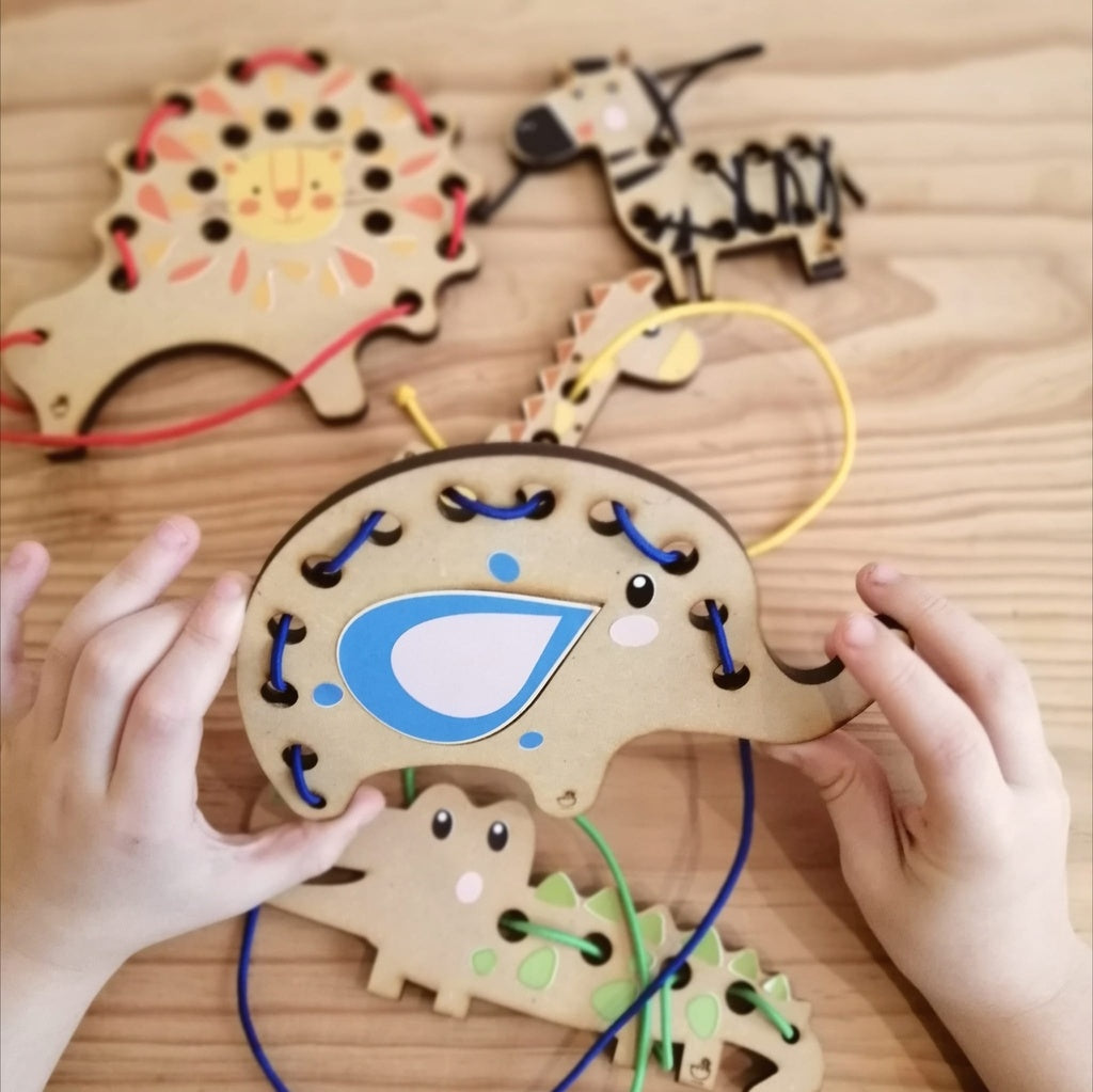 El enhebrado favorece la concentración y permite ejercitar la coordinación óculo-manual y la motricidad fina. Además, a través de este jugo con animales, se reconocen formas y colores.