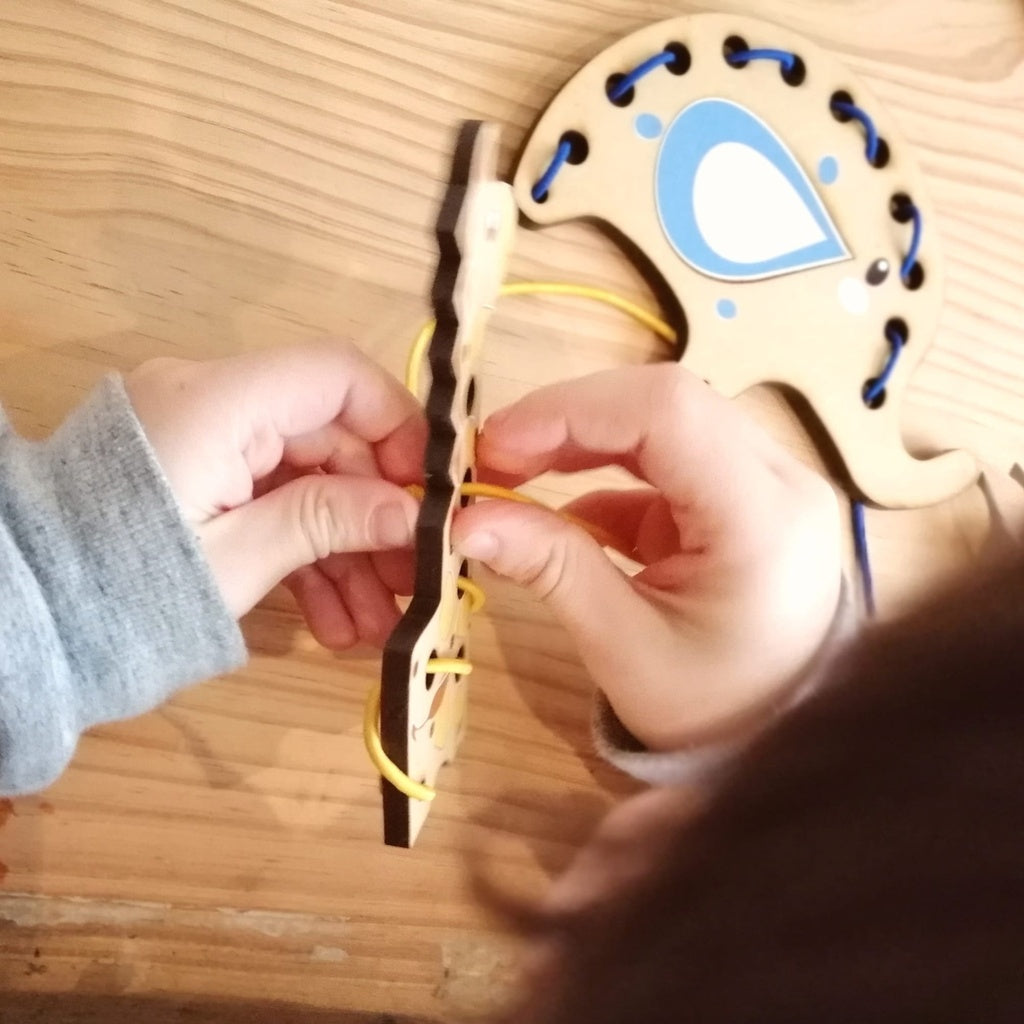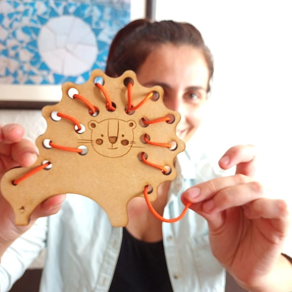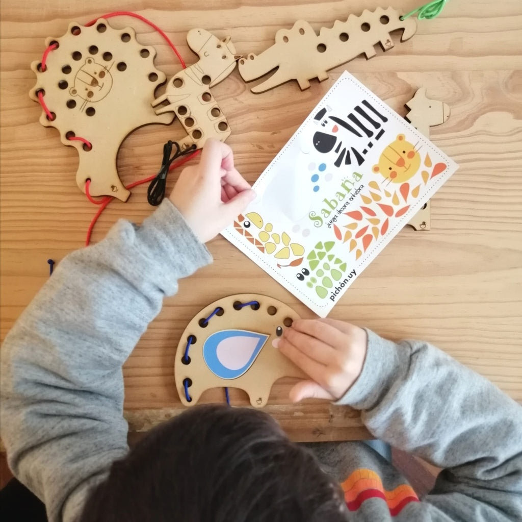 El enhebrado favorece la concentración y permite ejercitar la coordinación óculo-manual y la motricidad fina. Además, a través de este jugo con animales, se reconocen formas y colores.
