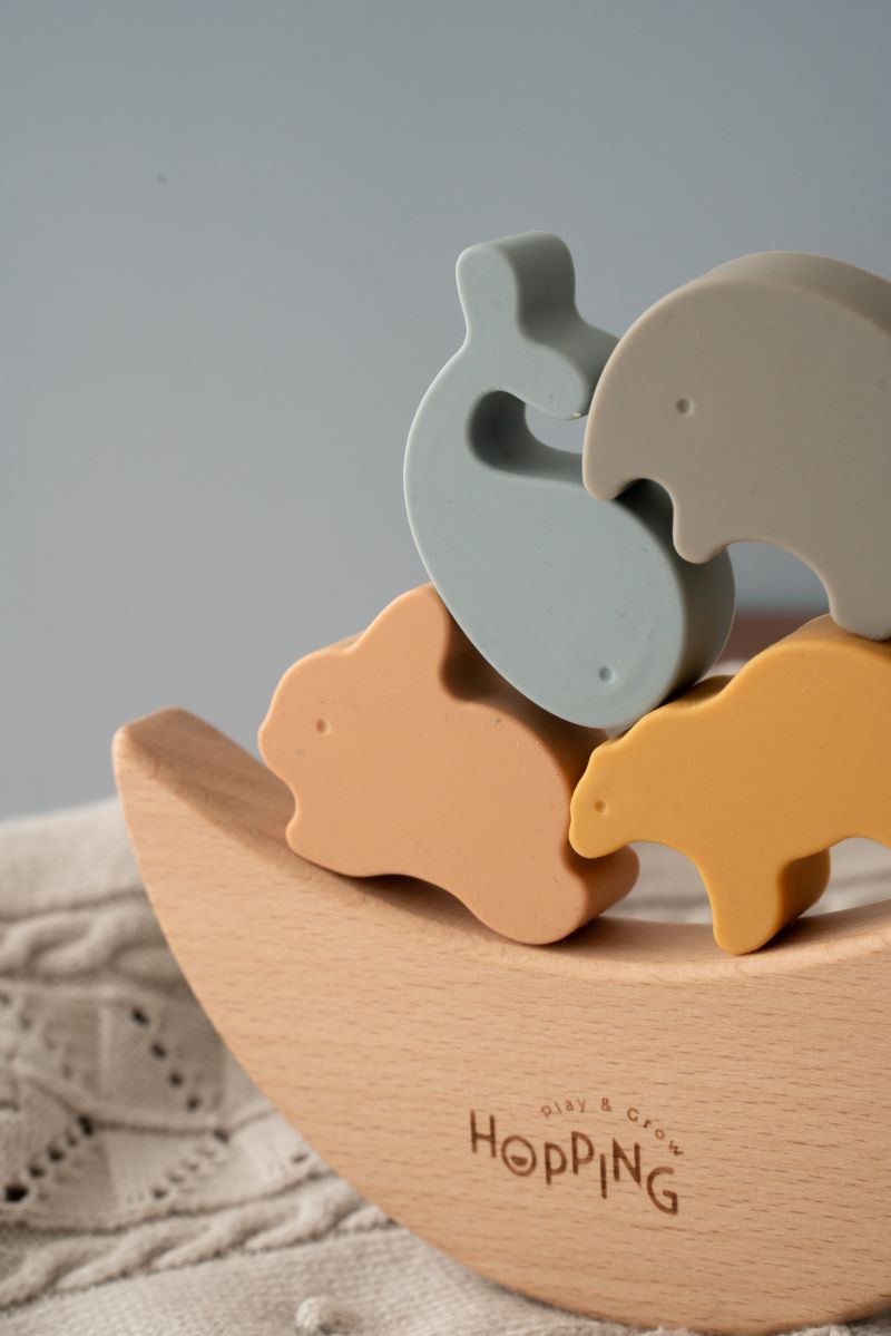 Incluye arco de madera natural y 4 piezas de silicona no tóxica, BPA free.