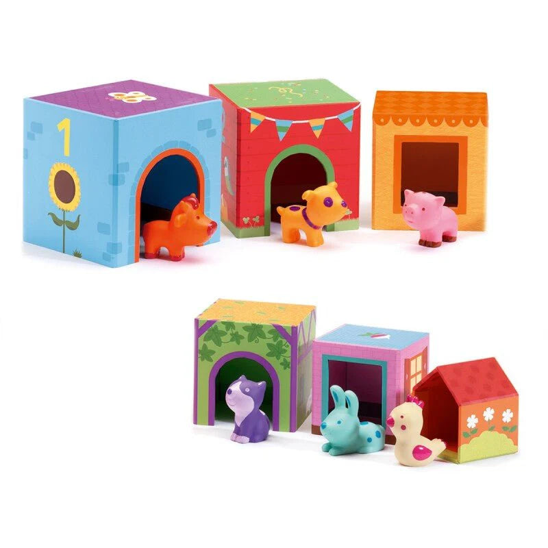 Juego de construcción de Djeco para estimular la imaginación y el juego haciendo torres, conjuntos o guardando a los animales en su casita.