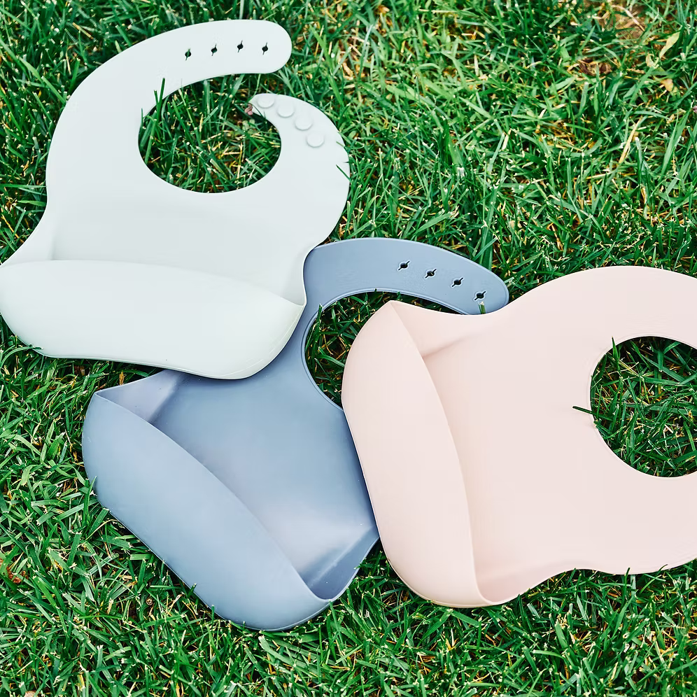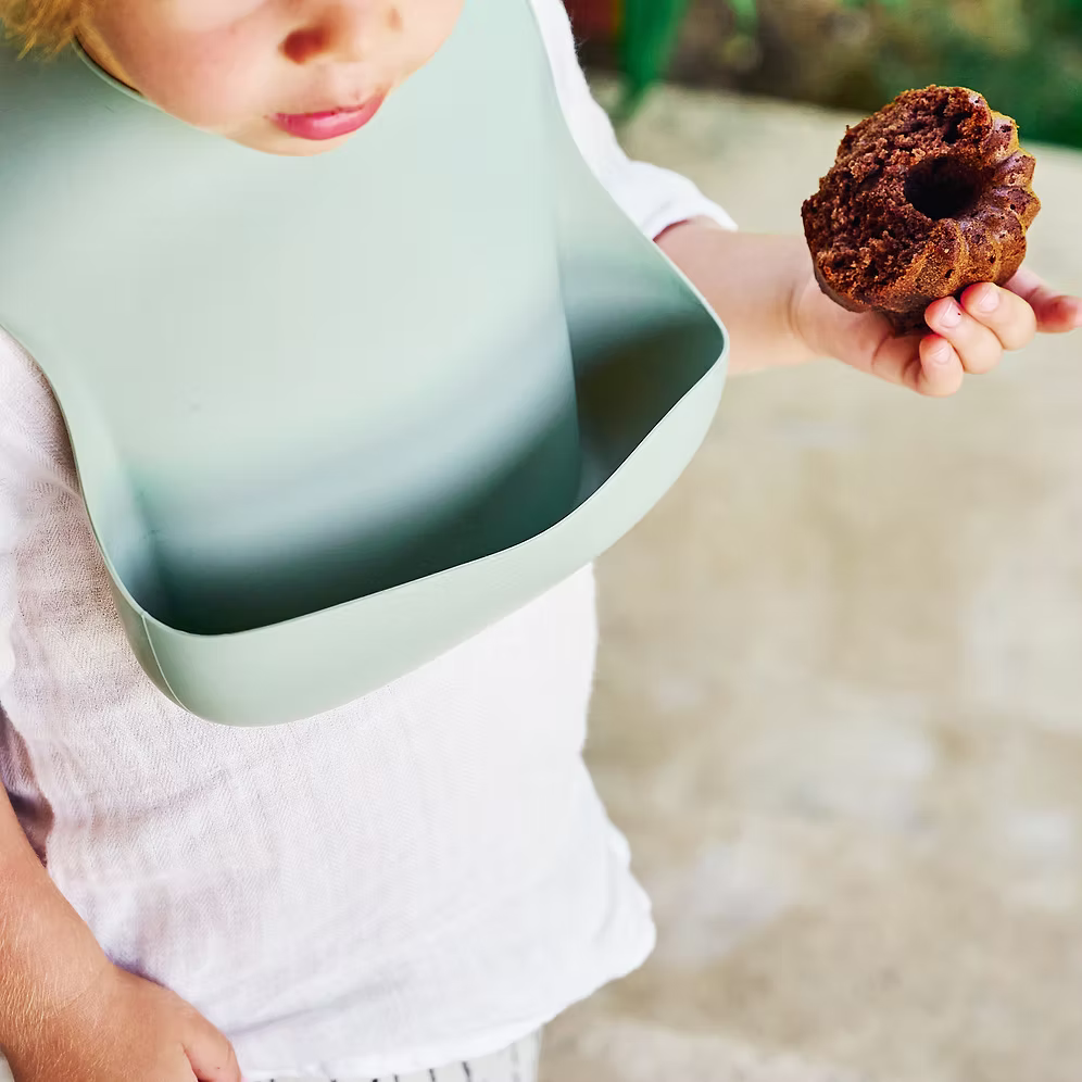 Babero de silicona diseñado para acompañar las primeras comidas de forma práctica y cómoda, favoreciendo la autonomía durante la alimentación.