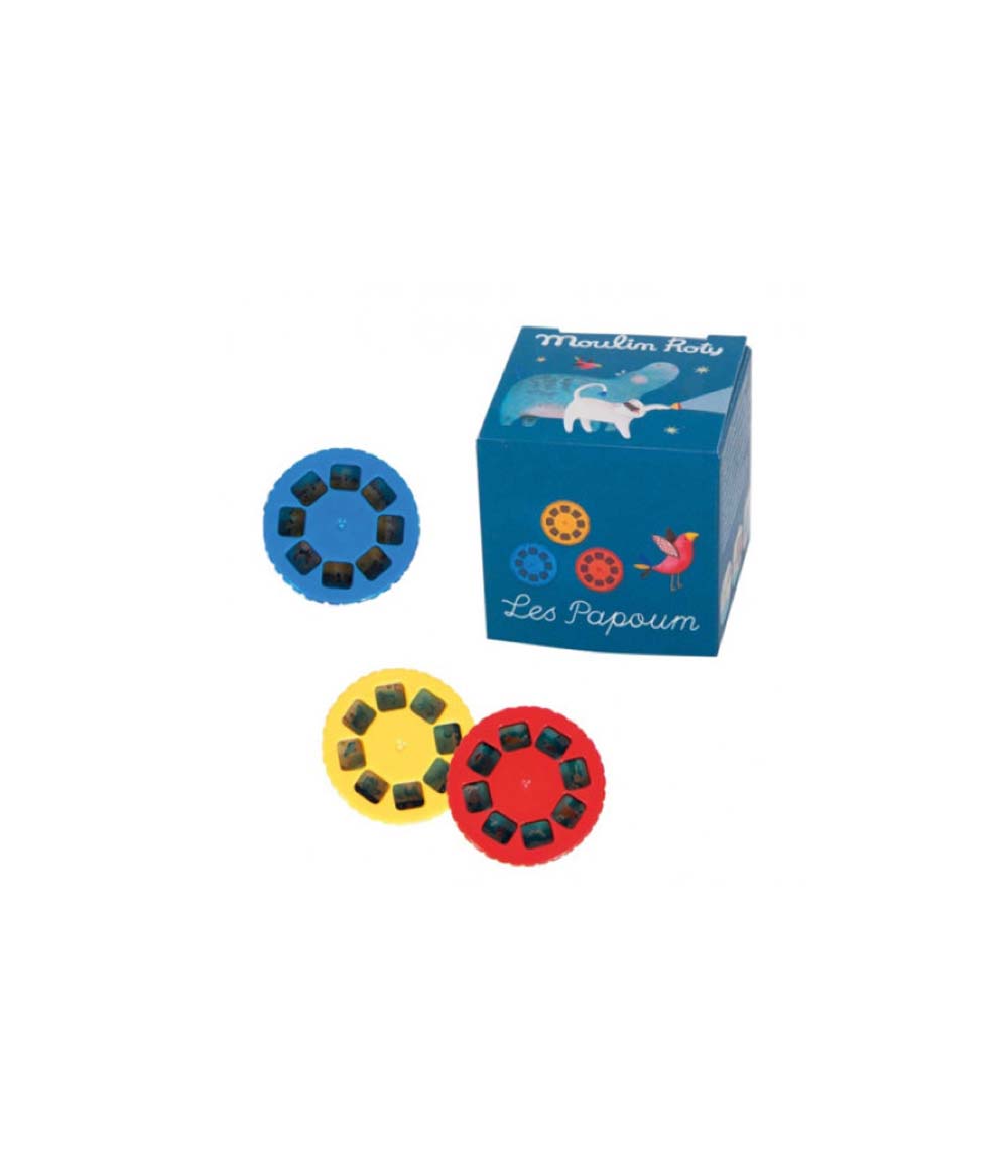 Esta Caja con 3 discos de cuentos para linterna proyectora incluye 3 cuentos de los personajes de la "Les Papoum". Sólo necesitas la linterna proyectora, uno de los discos y listo, ¡apaga la luz y proyecta en la pared o el techo! y deja andar tu imaginación.