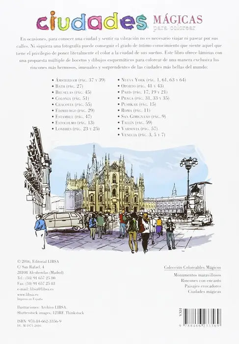 Un libro para colorear que invita a descubrir ciudades llenas de encanto a través del arte y la imaginación. Cada página presenta ilustraciones detalladas inspiradas en paisajes urbanos y escenarios mágicos, perfectos para dar vida con colores.