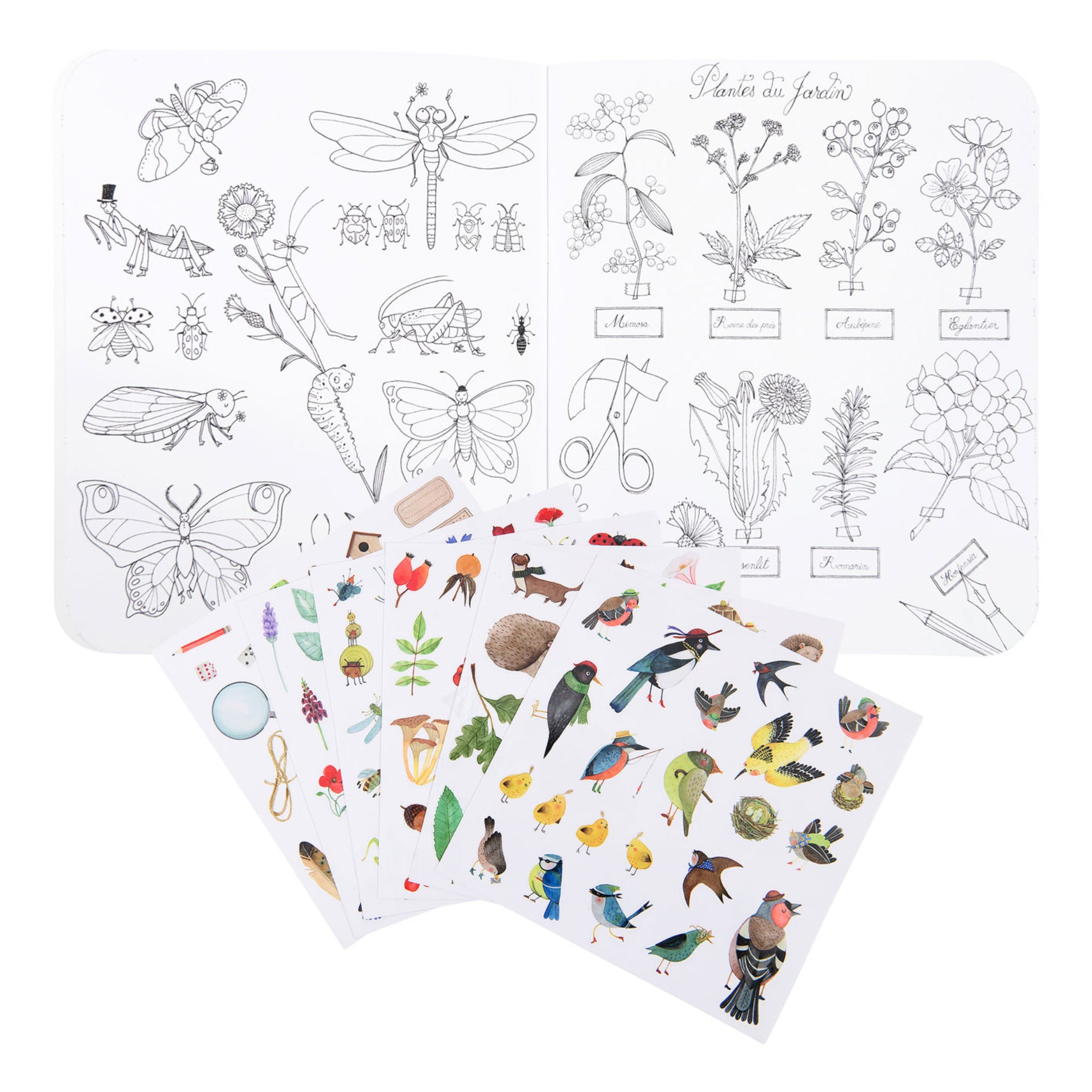 Un cuaderno para colorear sobre la naturaleza, plantas y animales, con hermosos stickers sobre flora y fauna.