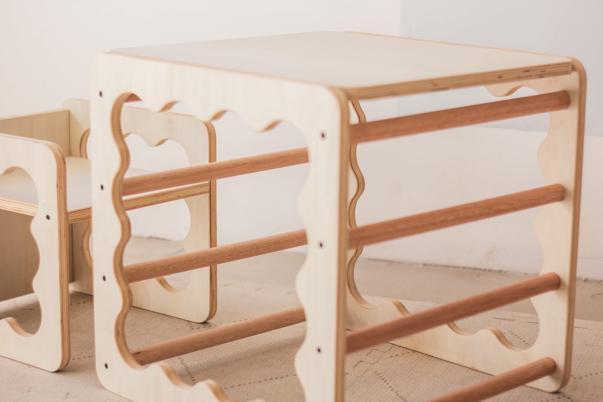 Material: Madera multiplaca de álamo de 18 mm, bordes redondeados, terminación en hidrolaca a base de agua.