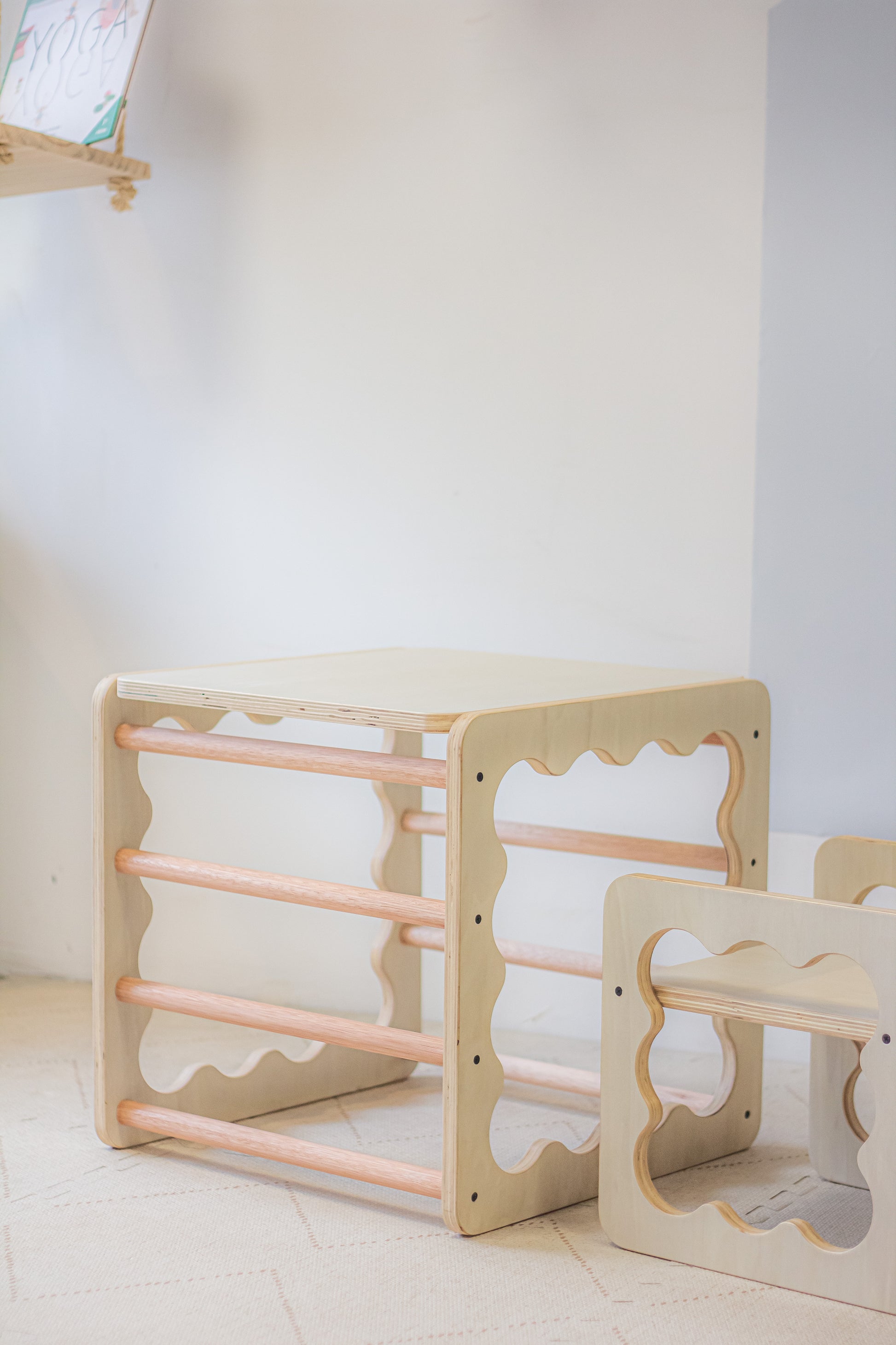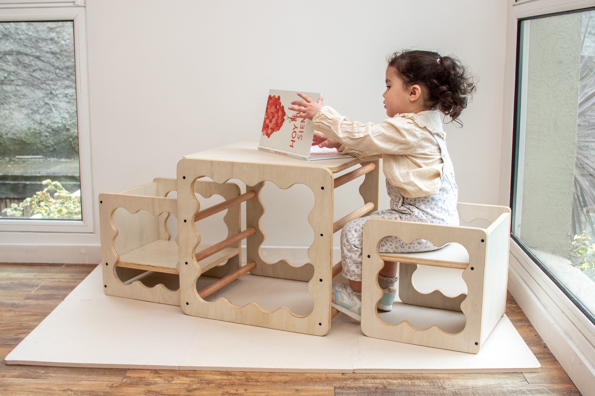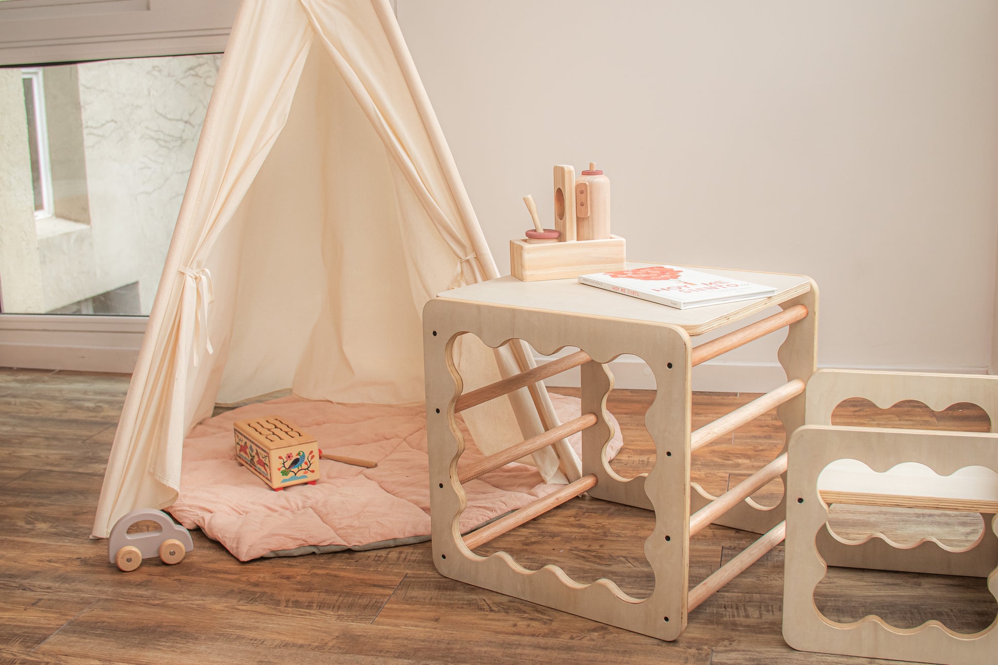 Inspirado en el mobiliario diseñado por la pediatra húngara Emmi Pikler, este cubo acompaña la evolución natural del movimiento desde los primeros desplazamientos hasta el juego simbólico.