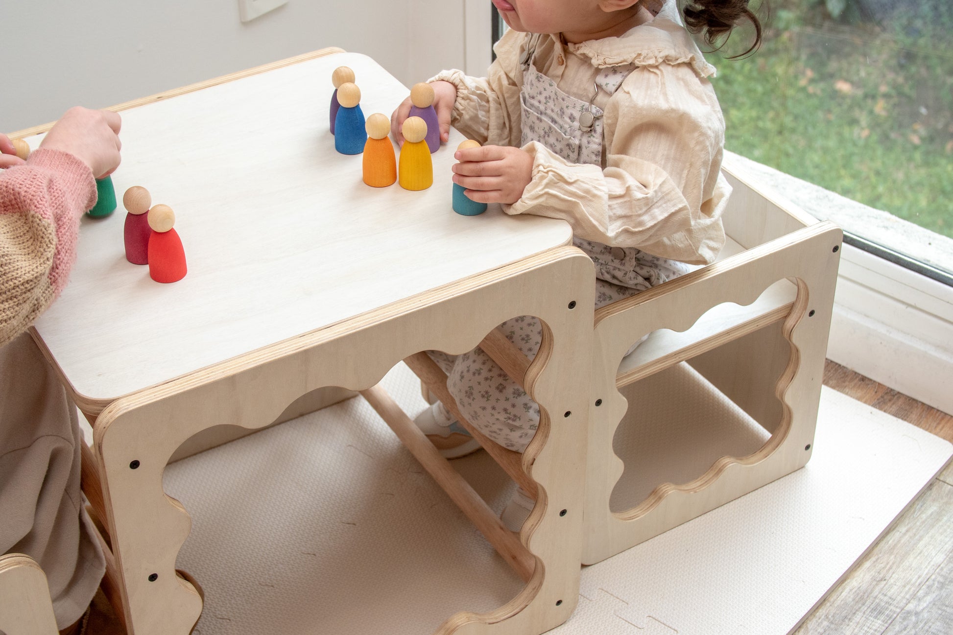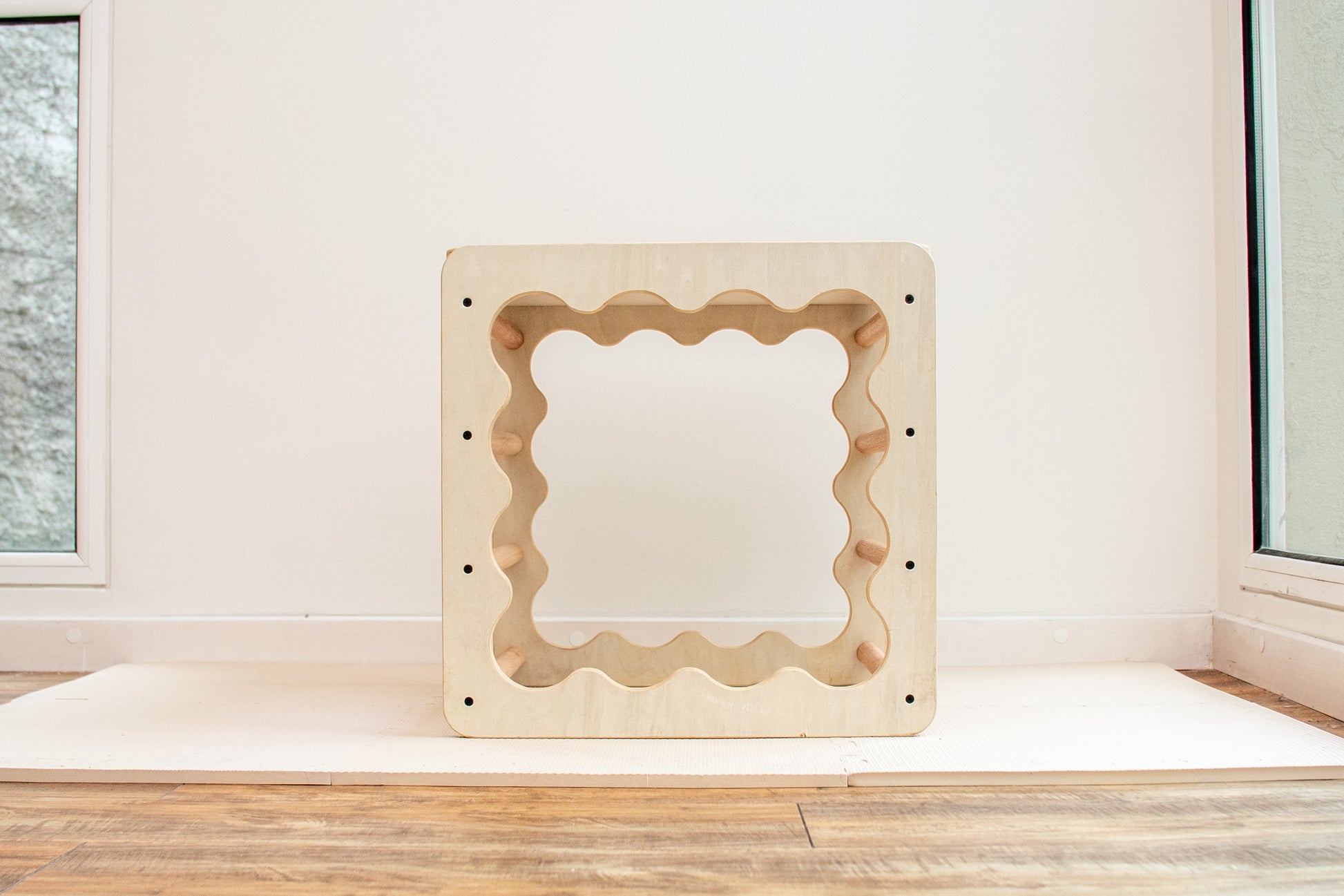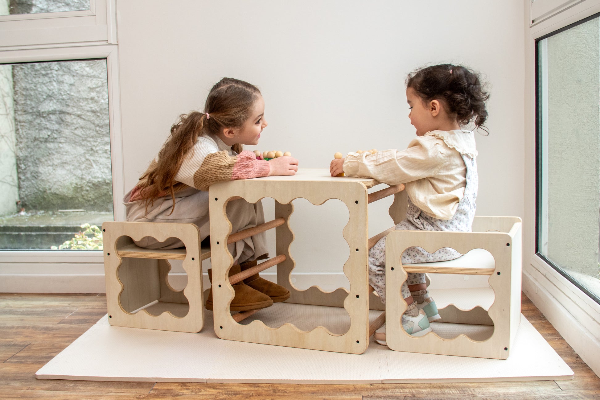 Inspirado en el mobiliario diseñado por la pediatra húngara Emmi Pikler, este cubo acompaña la evolución natural del movimiento desde los primeros desplazamientos hasta el juego simbólico.