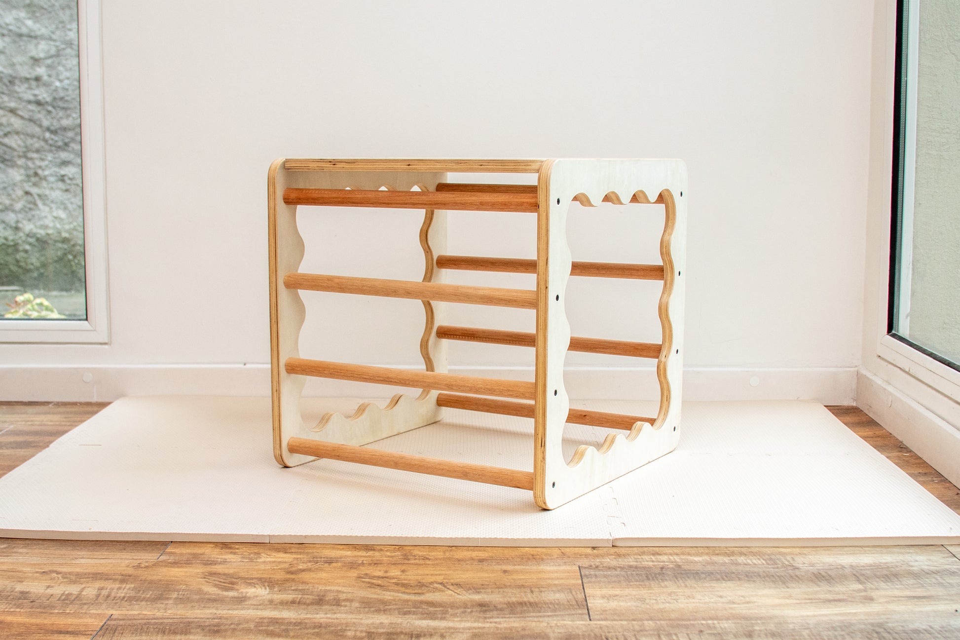 El cubo Pikler es mucho más que una estructura de juego: es una herramienta diseñada para acompañar el desarrollo motor de manera respetuosa y segura.