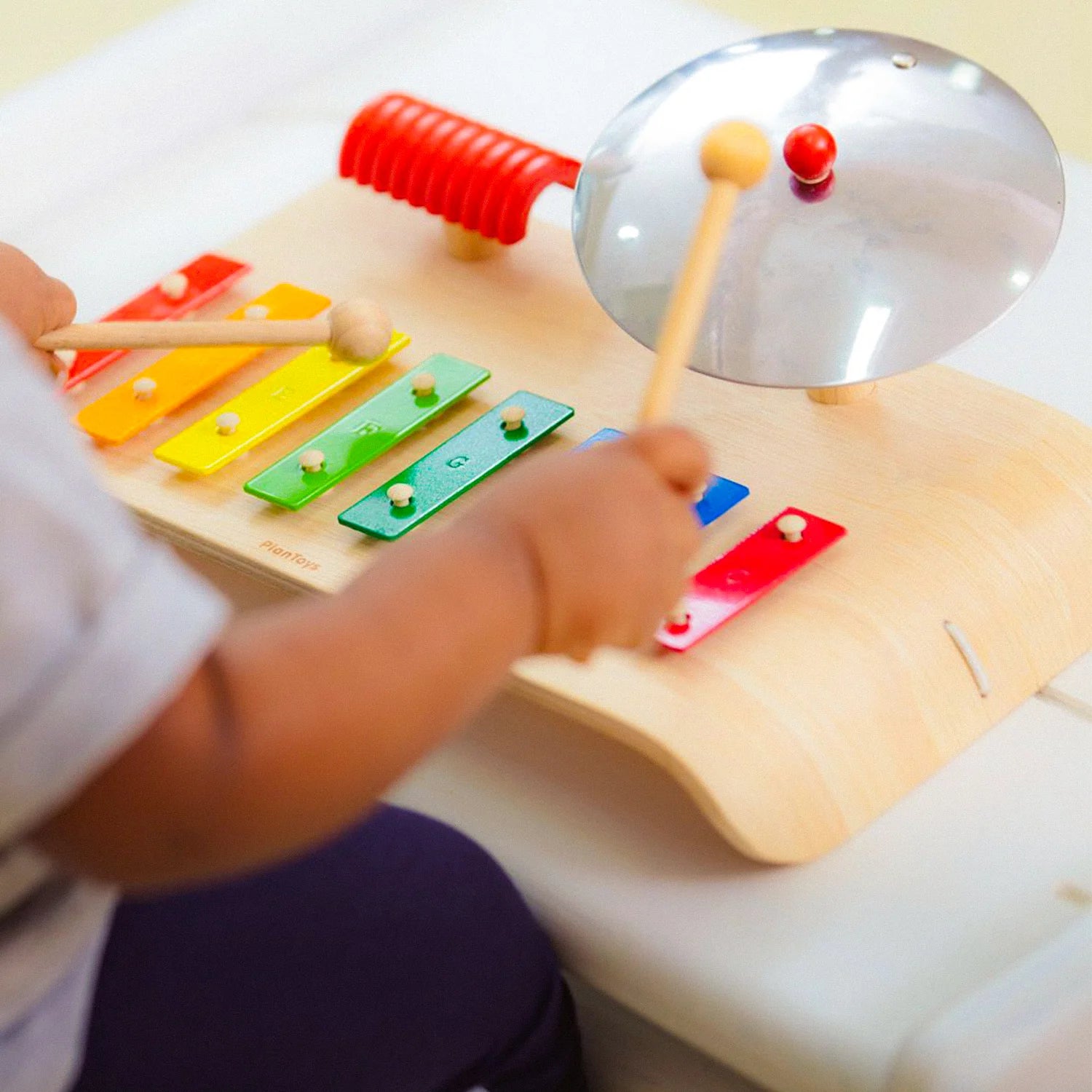 Para convertirse en pequeños músicos, este set de música viene con xilófono melódico; platillo y güiro que ayuda a mejorar la coordinación ojo-mano y aumenta la habilidad de concentración.