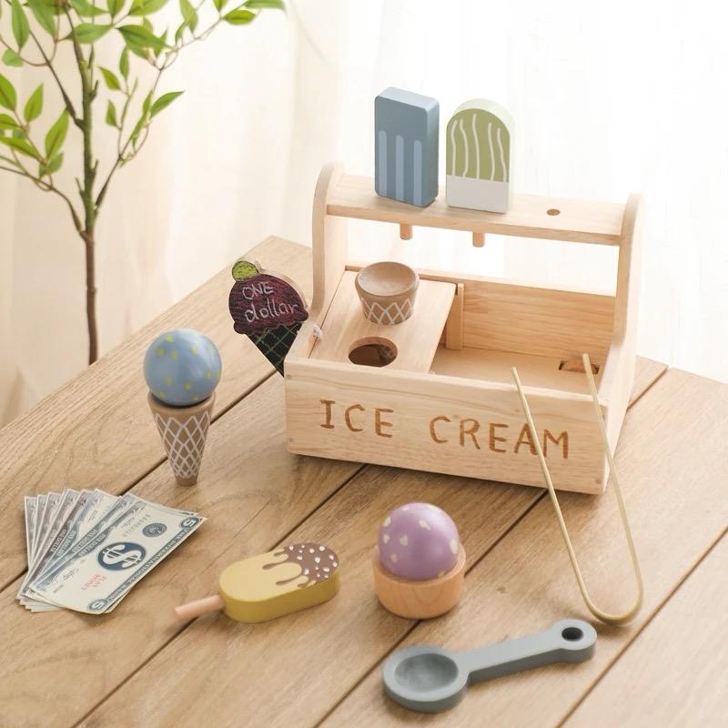 Incluye una variedad de helados, herramientas de servicio y billetes de juguete, todo meticulosamente diseñado para brindar horas de diversión, fomentar el juego simbólico y las habilidades sociales.