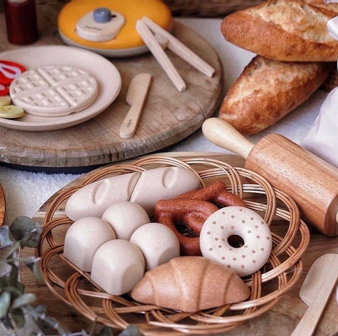 Este juego incluye un bagel, 4 pancitos desmontables, un pretzel, un croissant, una baguette para cortar, un cuchillo y una panera de tela para guardar.