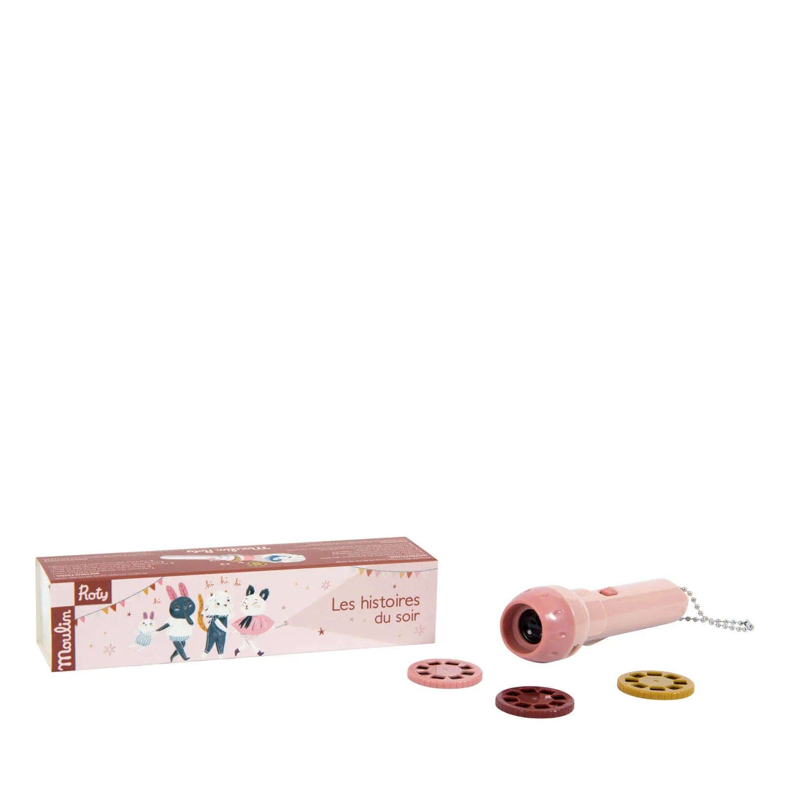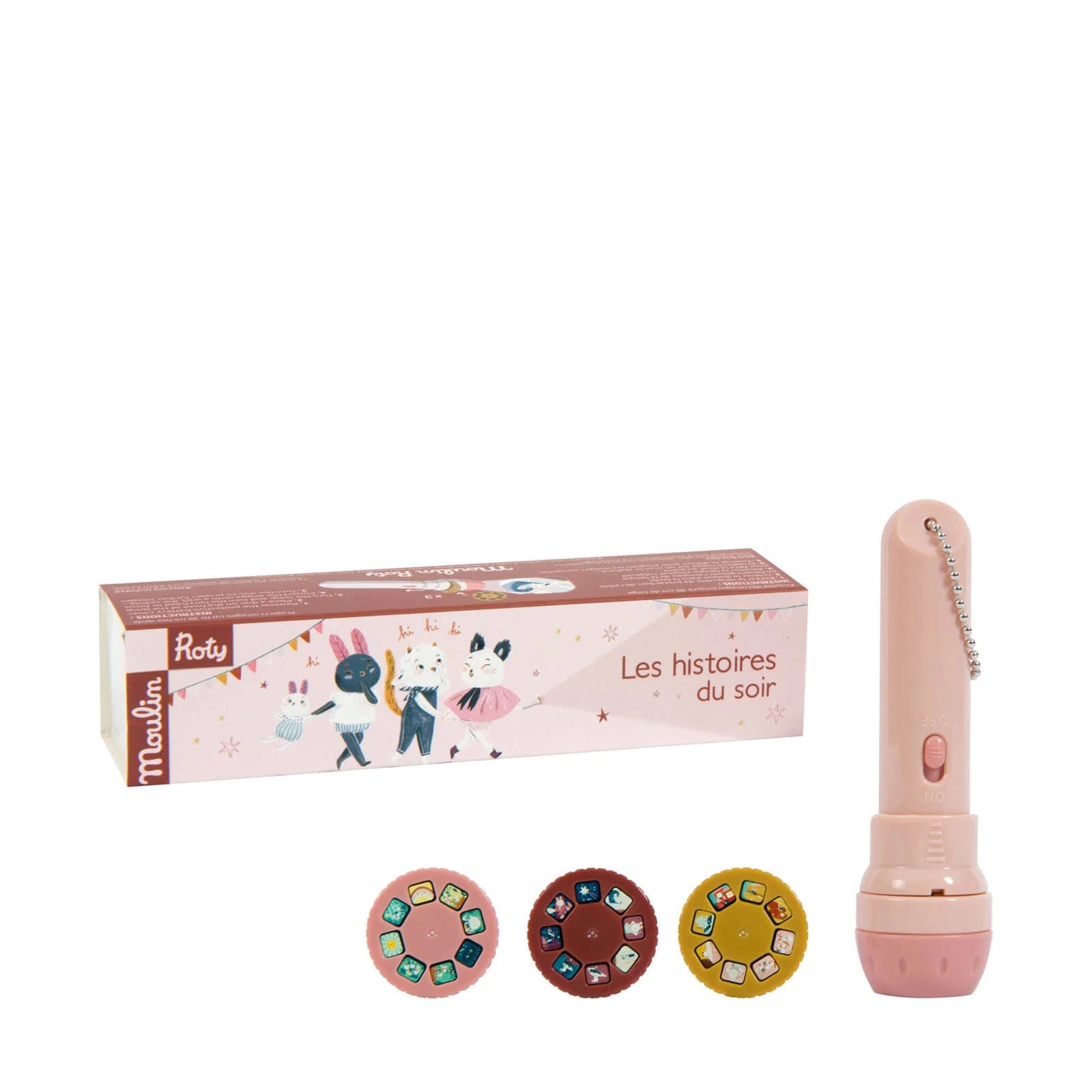 La Linterna Proyectora de Historias se compone de una pequeña linterna a la que podemos insertar 3 ruedas con historias que cuentan 3 historias distintas.