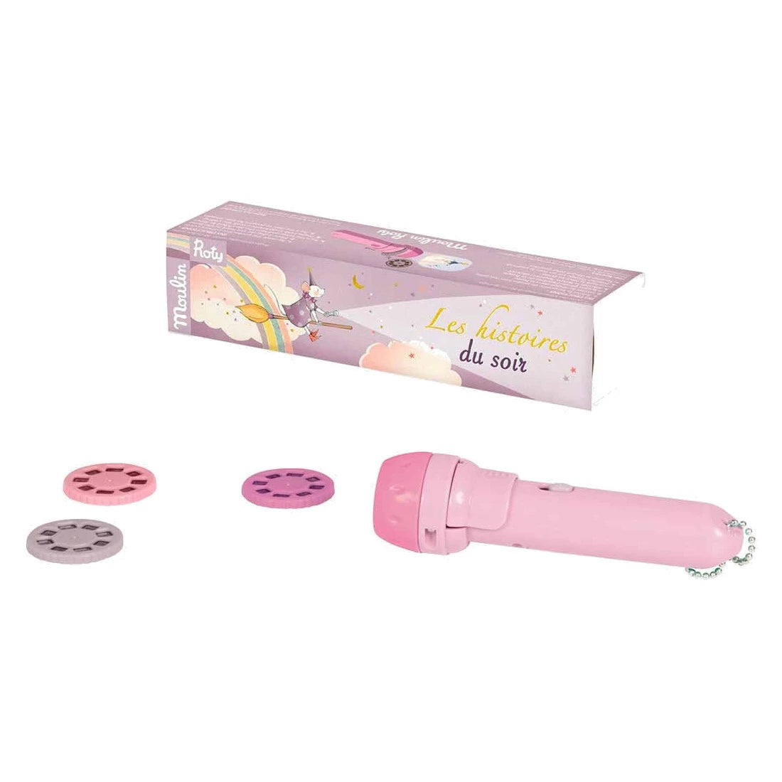 Linterna Proyectora de Historias Il Etait Une Fois se compone de una pequeña linterna a la que podemos insertar 3 ruedas con historias que cuentan historias de 3 animales.