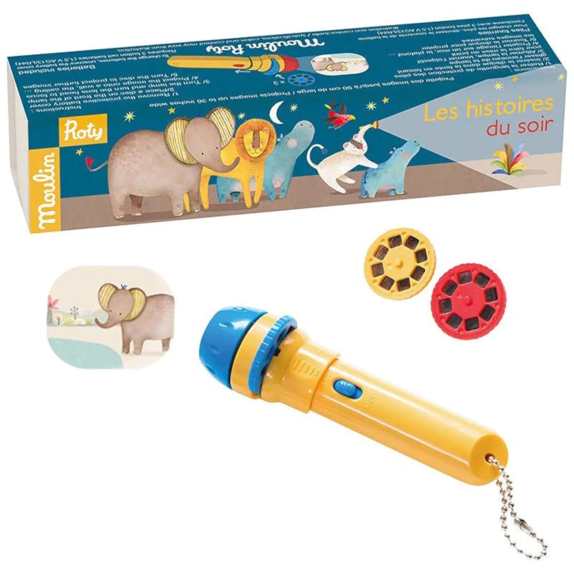 Linterna Proyectora de Historias de Les Papoum se compone de una pequeña linterna a la que podemos insertar 3 ruedas con historias que cuentan historias de 3 animales.