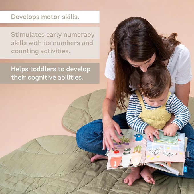 Un libro de tela con 12 actividades de aprendizaje de nuevas habilidades, pensado para acompañar a tu peque a lo largo de diversas etapas de su desarrollo.