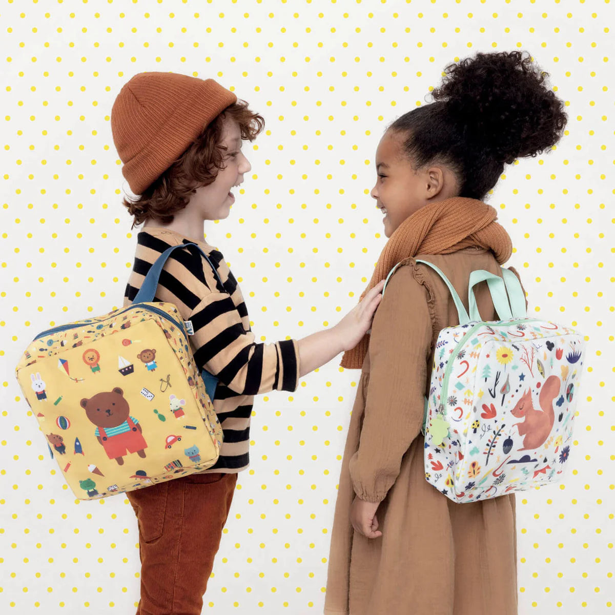 Mochila con diseño de ardilla y bosque, ideal para llevar todo lo que necesitan los más pequeños.