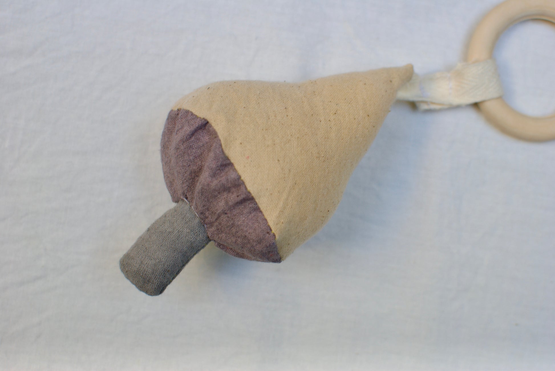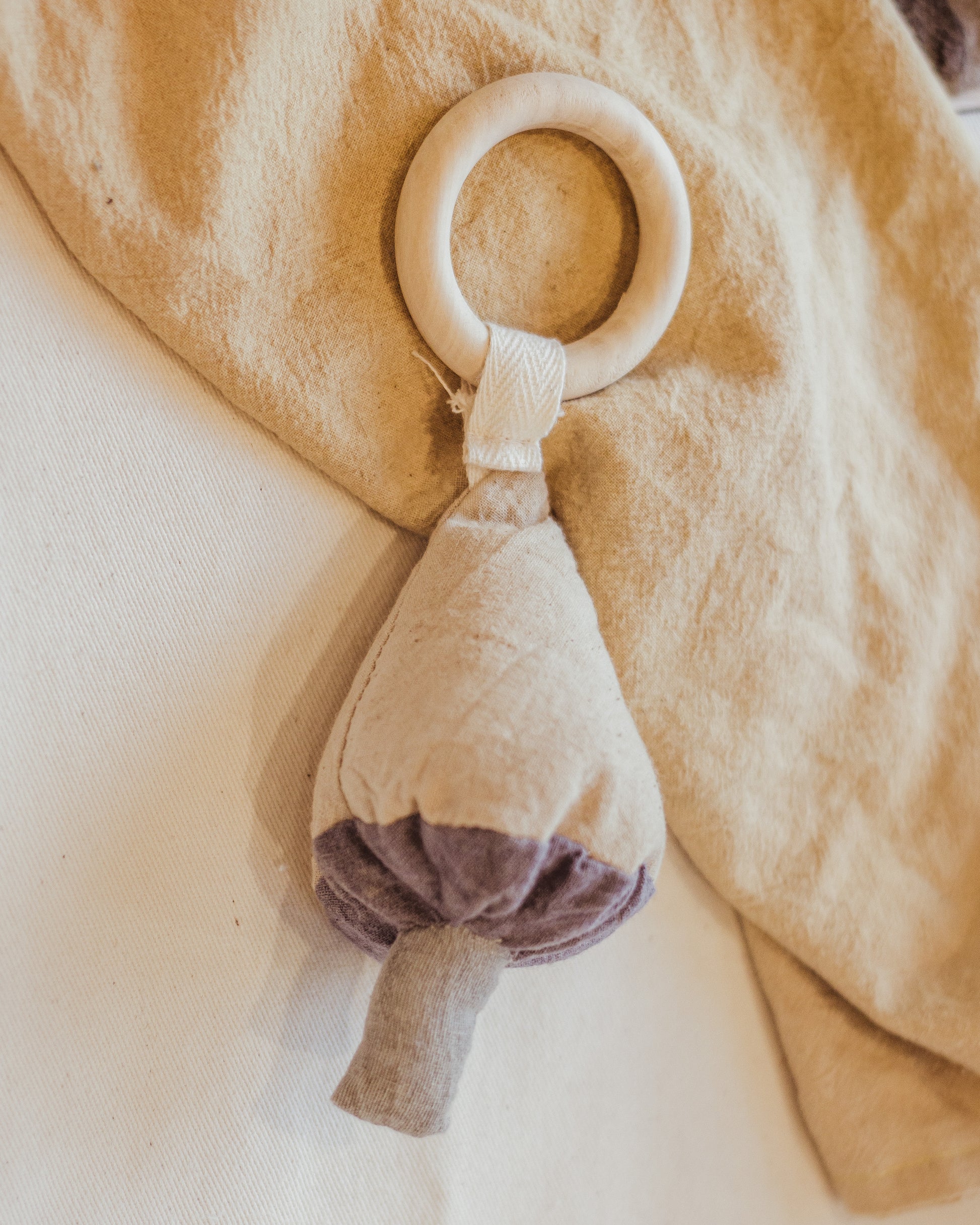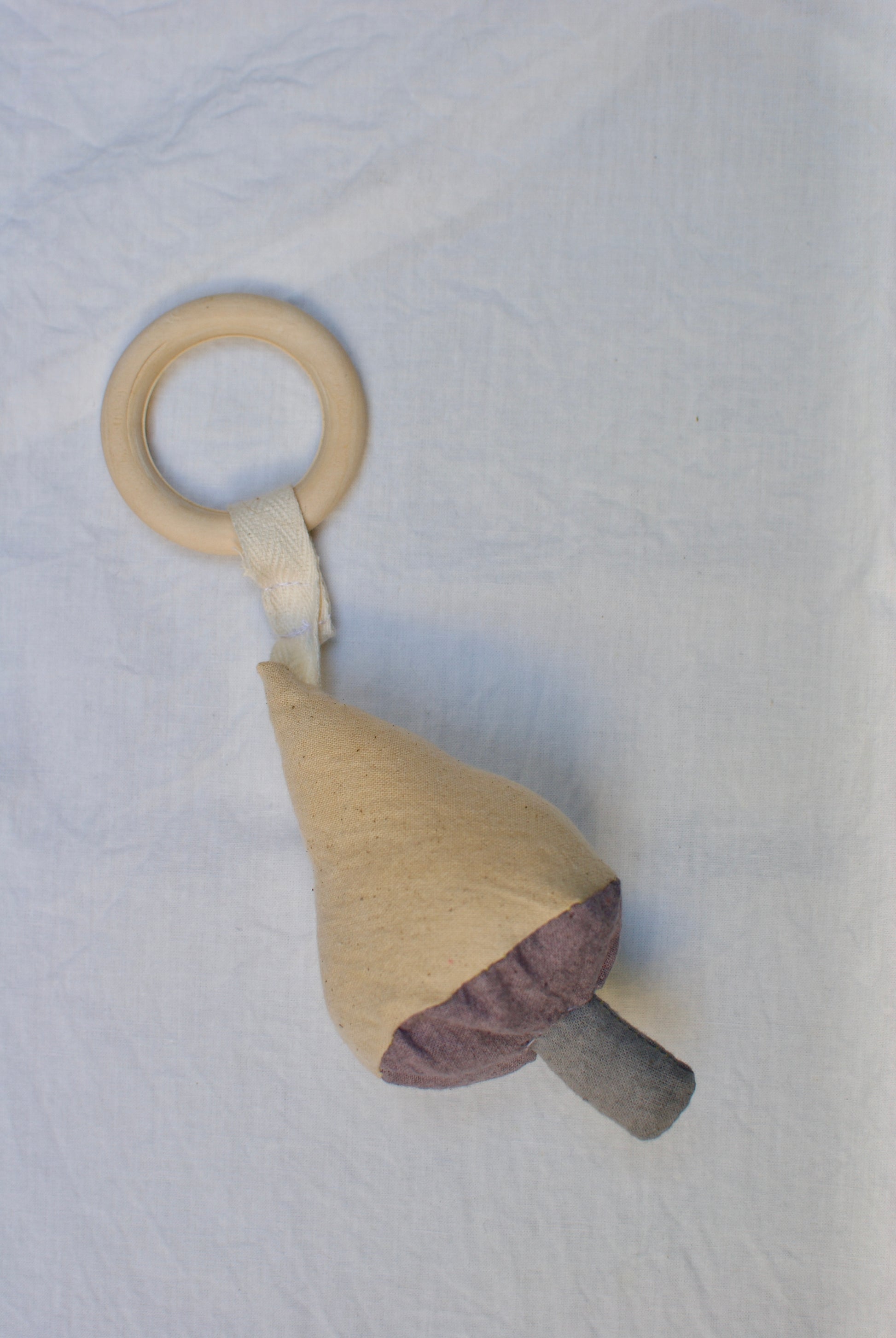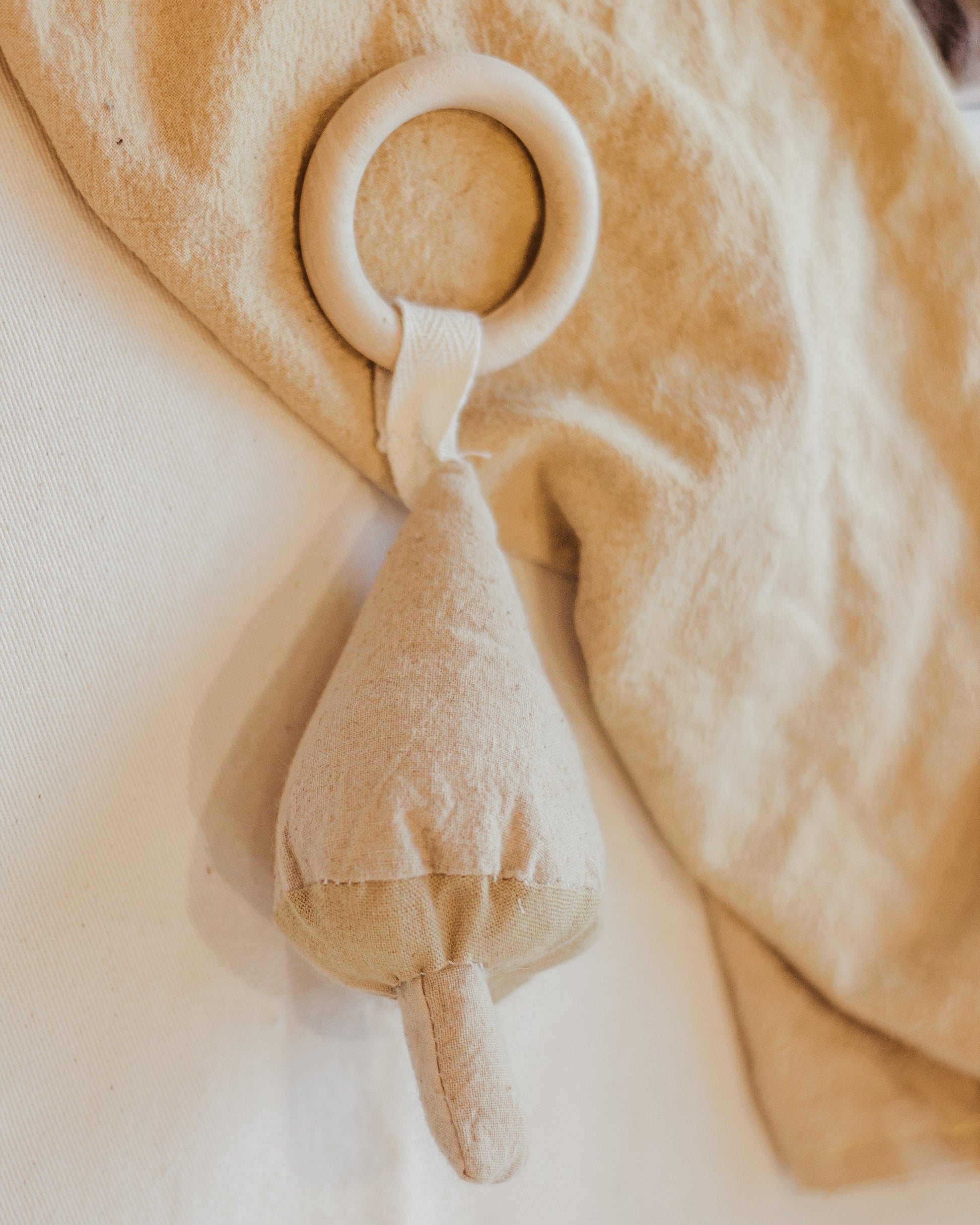 Un mordillo en tonos calmos, con un honguito para chupar en esa etapa en que todo va a la boca y con aro de madera, que es un material ideal para aliviar el dolor de las encías.