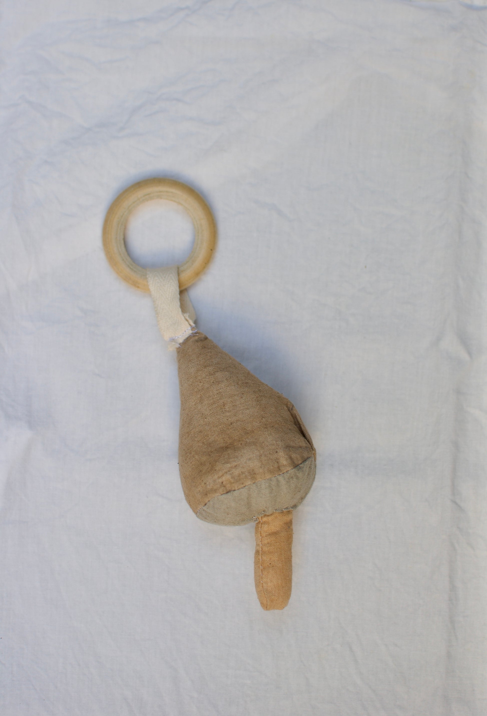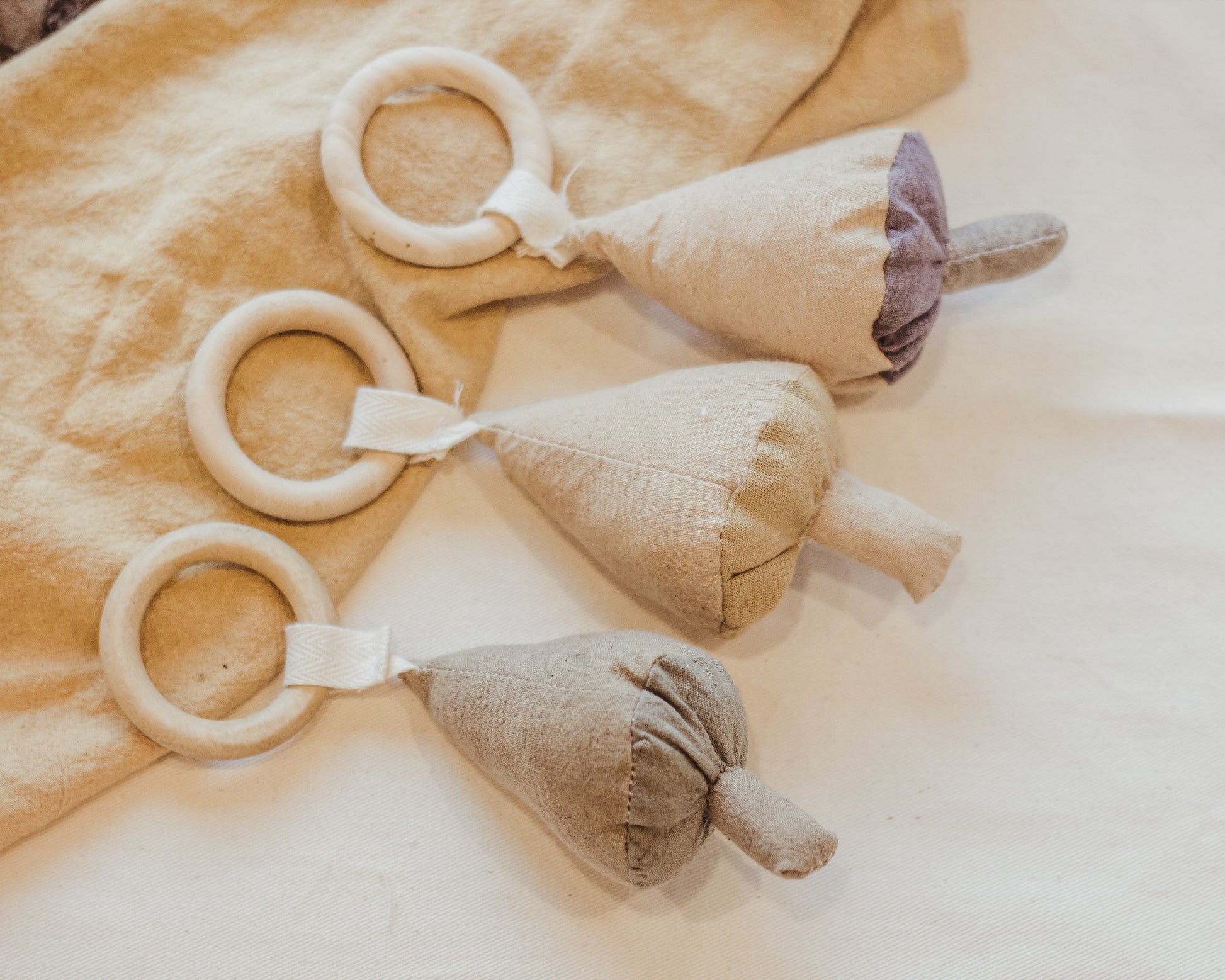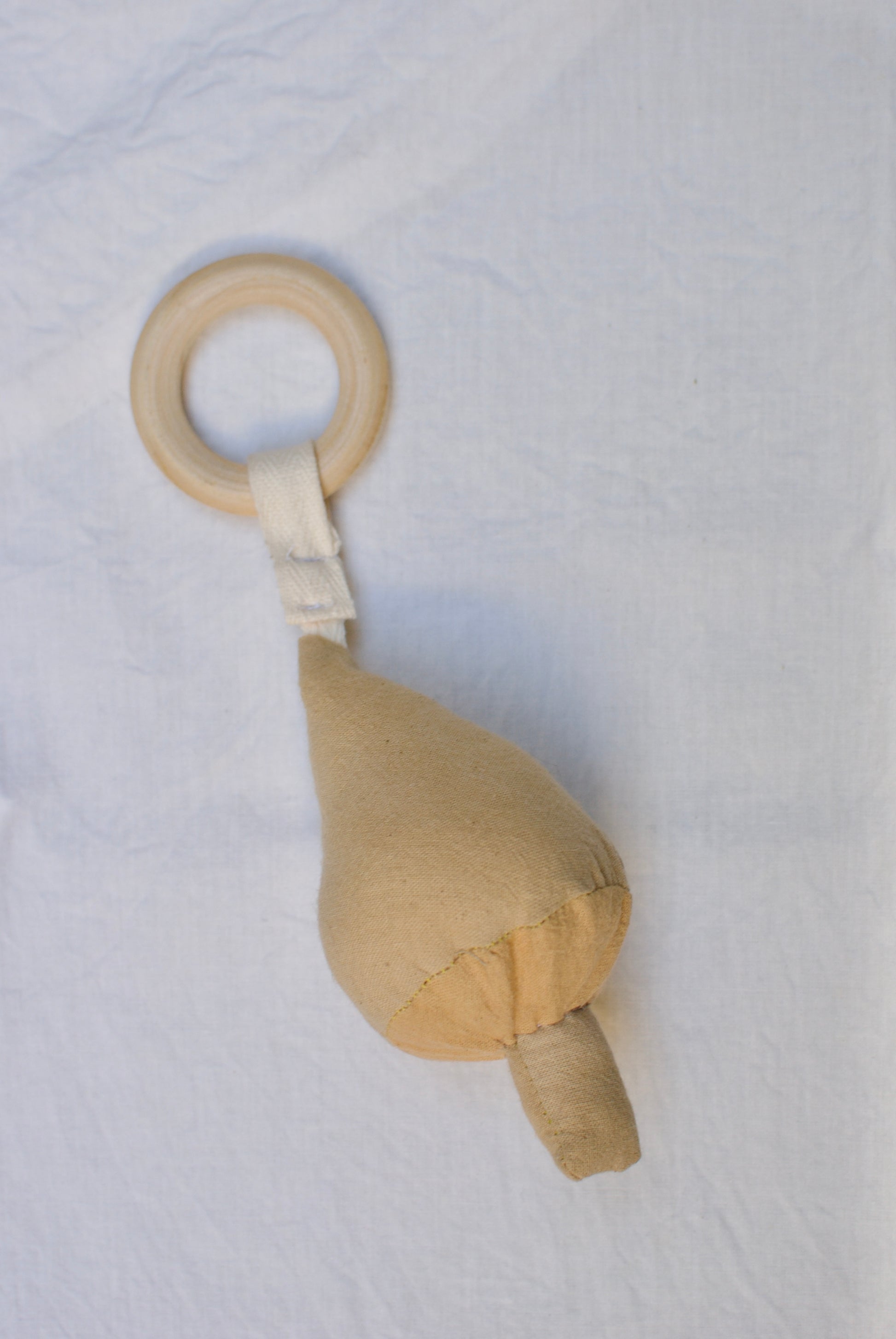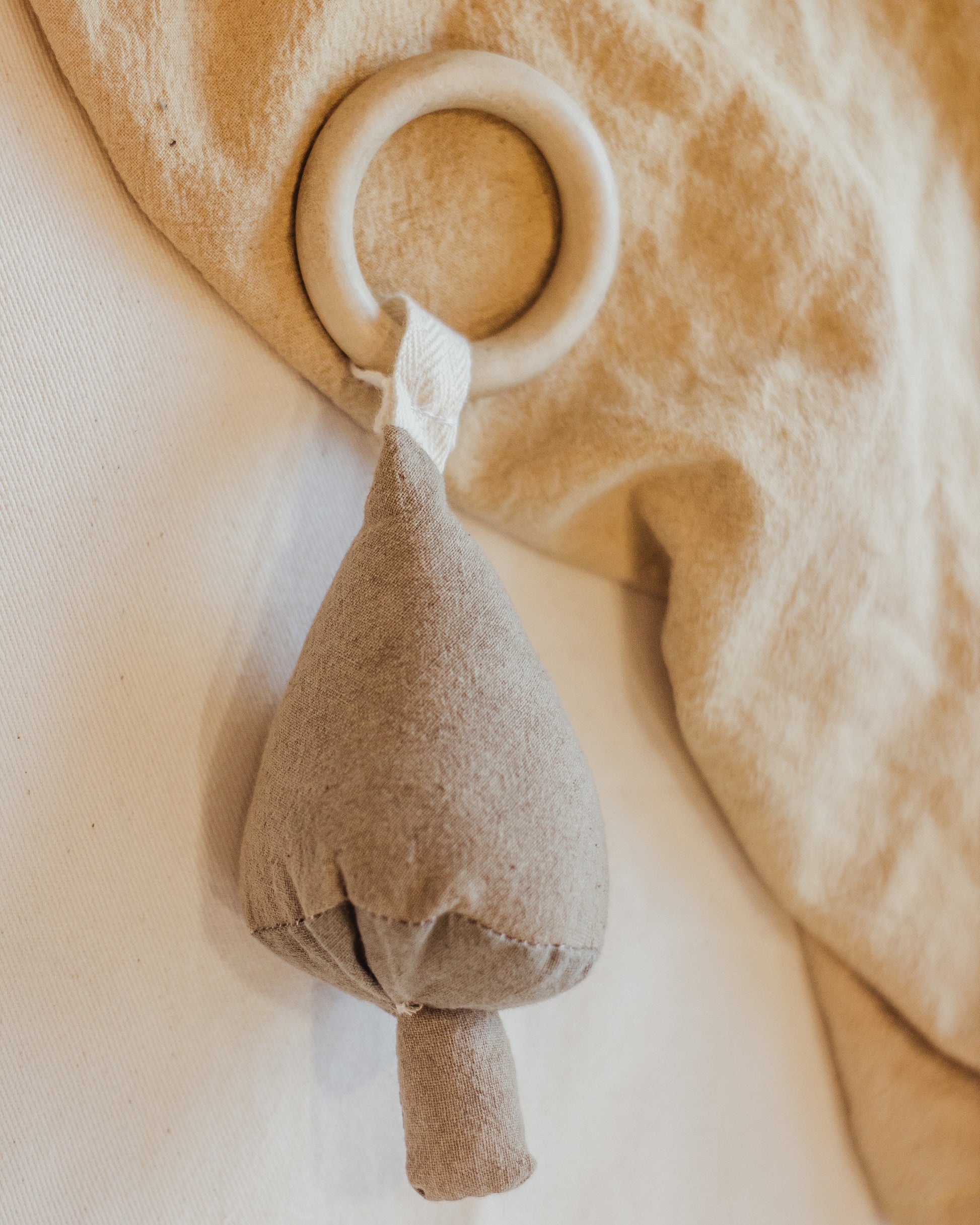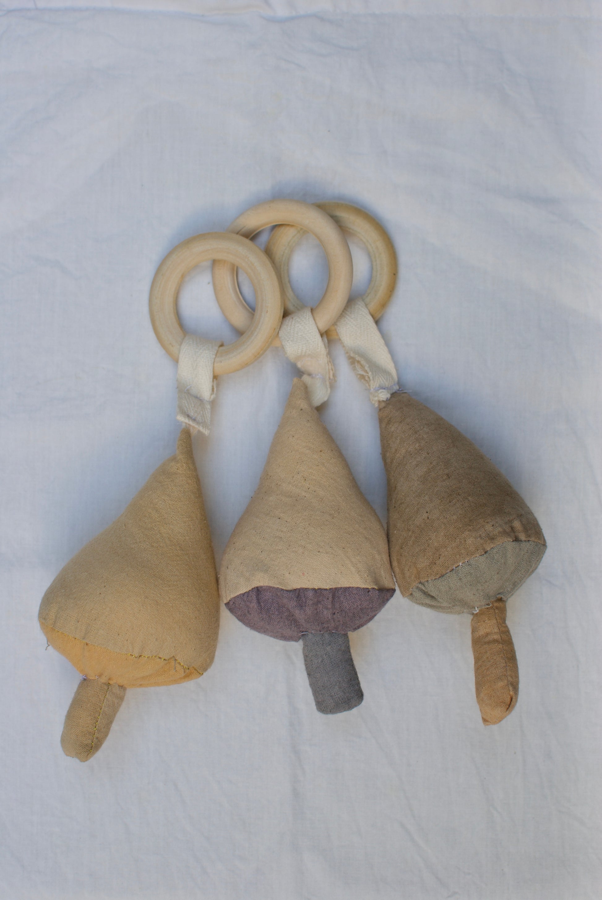 Un mordillo en tonos calmos, con un honguito para chupar en esa etapa en que todo va a la boca y con aro de madera, que es un material ideal para aliviar el dolor de las encías.
