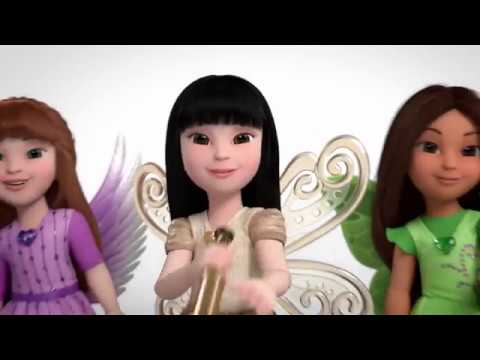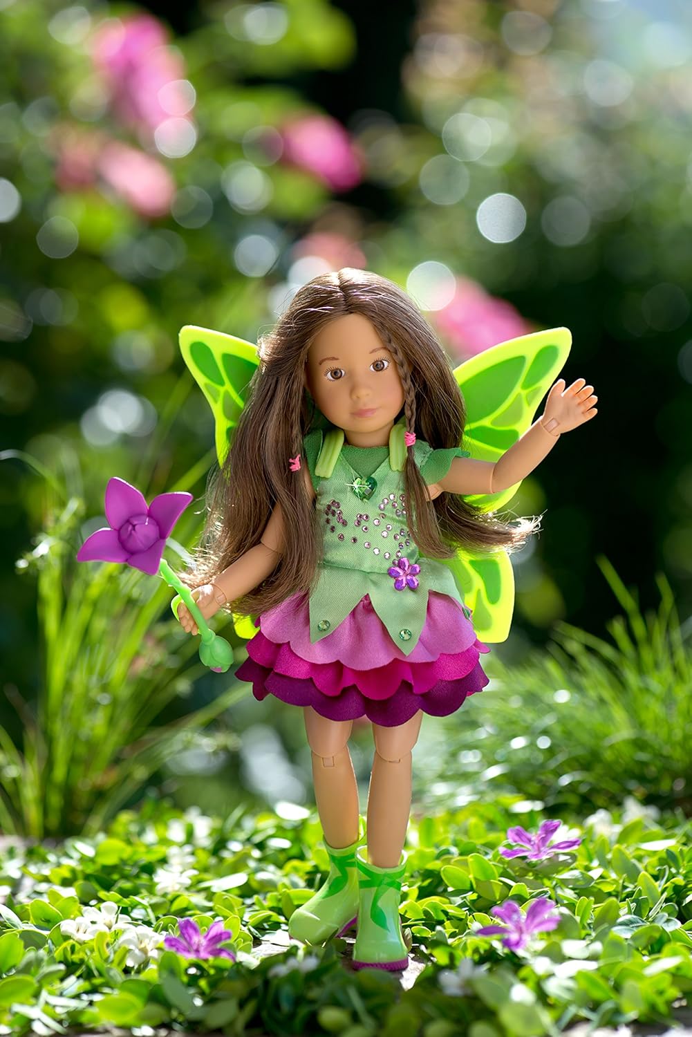Lleva su vestido mágico verde, botas, alas y su flor mágica.