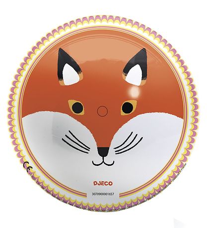 Pelota de 22 cm de diámetro, ilustrada con la carita de un zorro de un lado y de un oso pardo del otro.