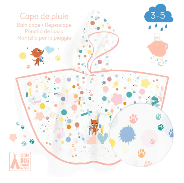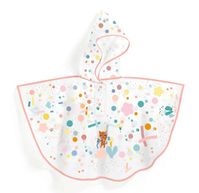 Un práctico poncho de lluvia con capucha con mucho estilo adornado con ilustraciones de una gatita artista.