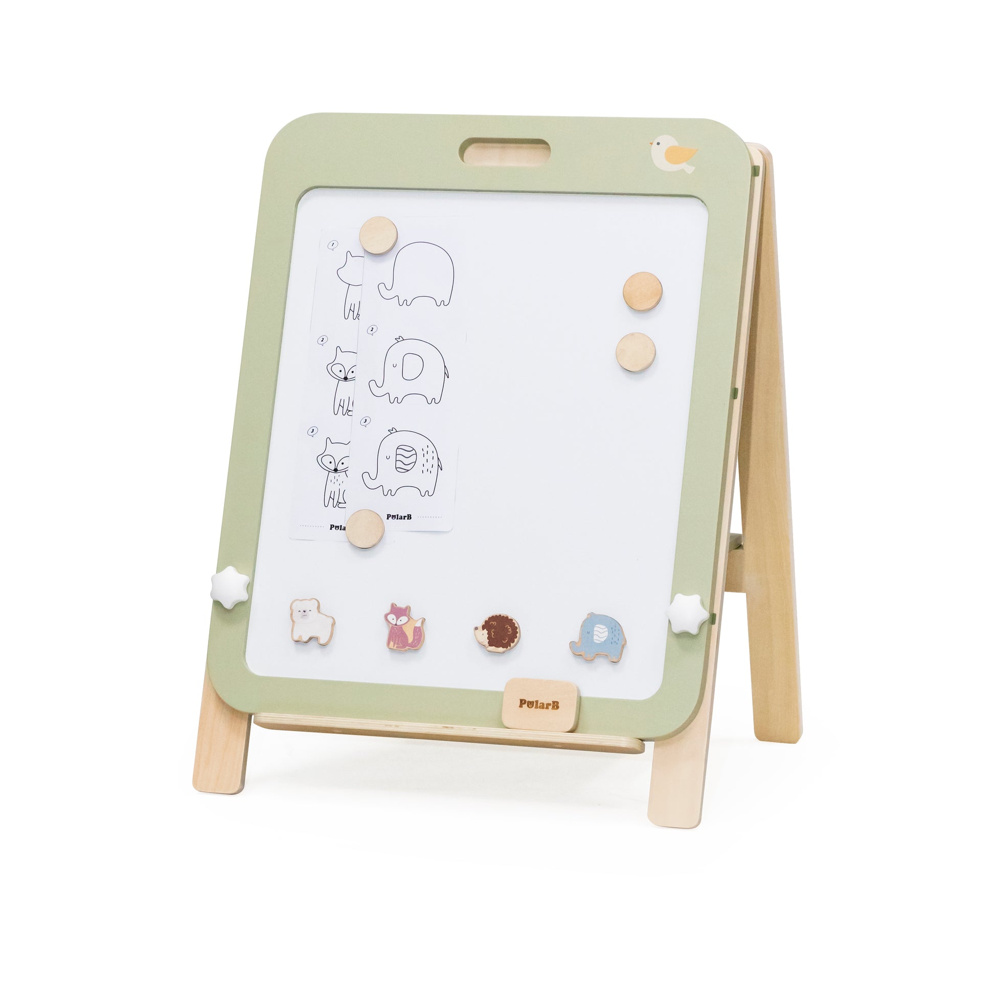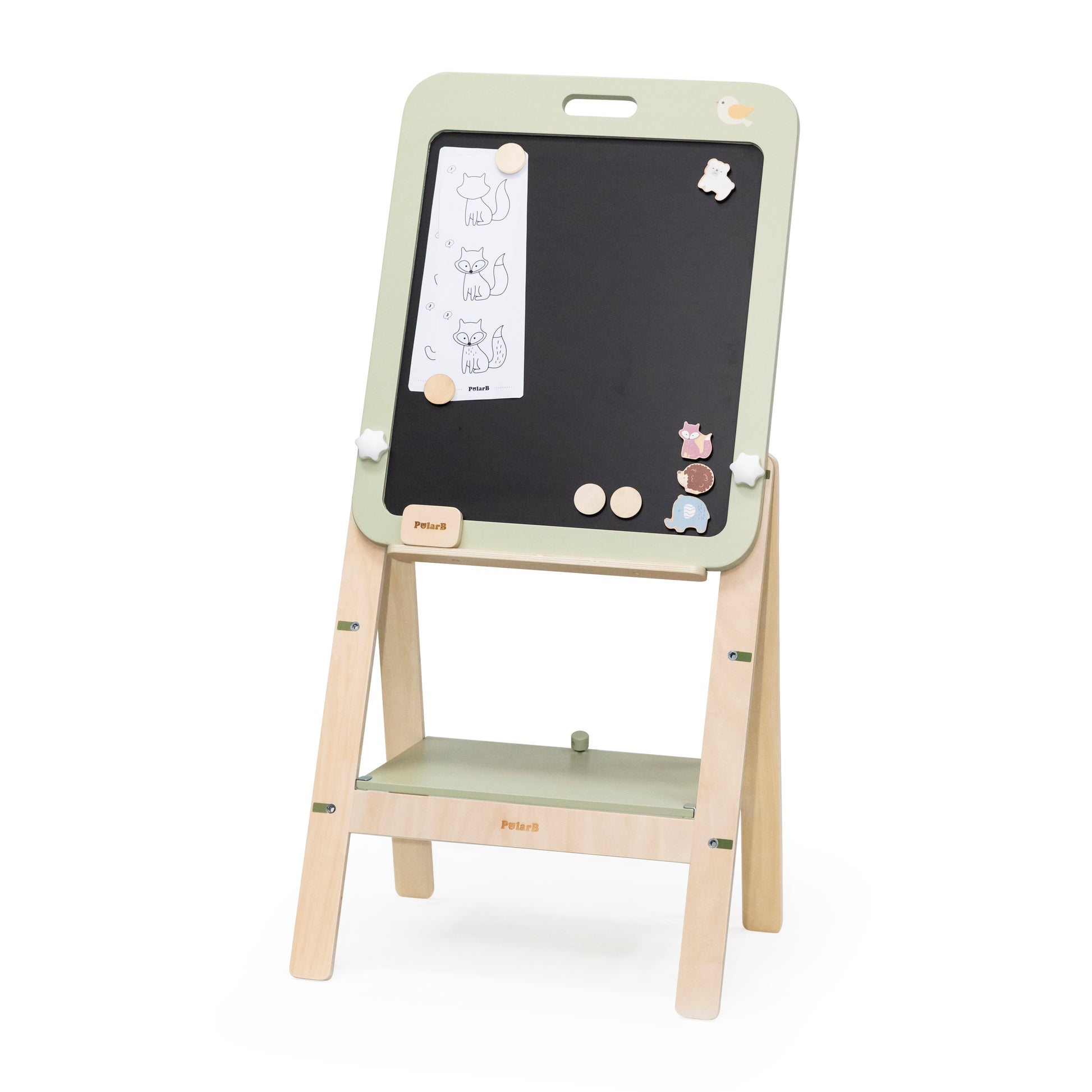 La pizarra de madera de doble cara de Polar B contiene dos lados de trabajo: negro para tiza y blanco para marcador y juegos magnéticos.