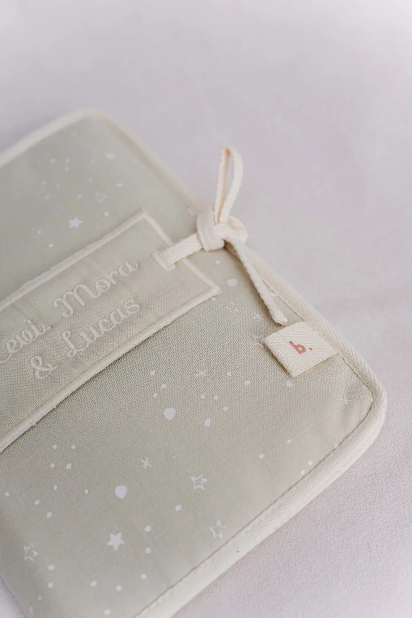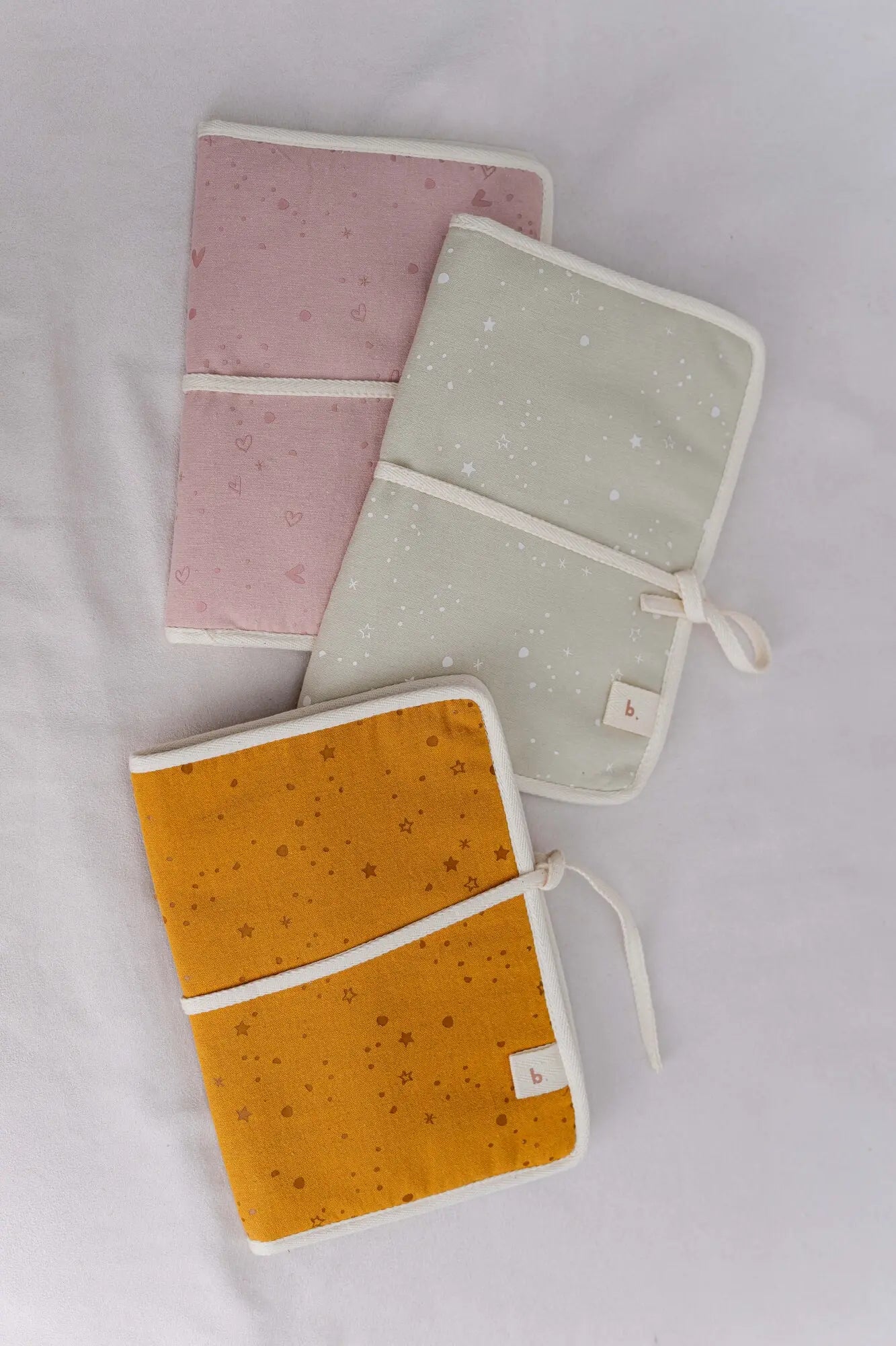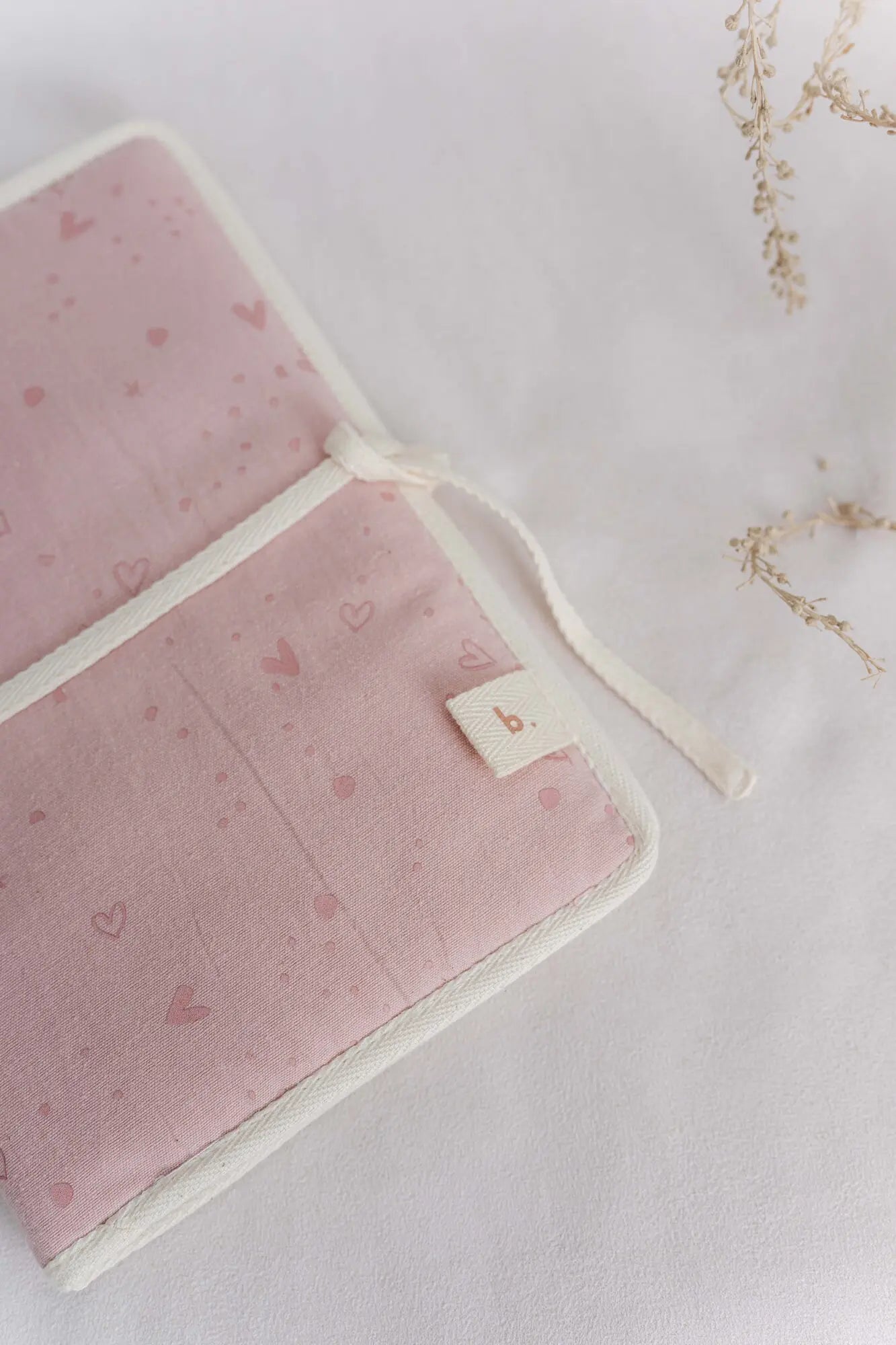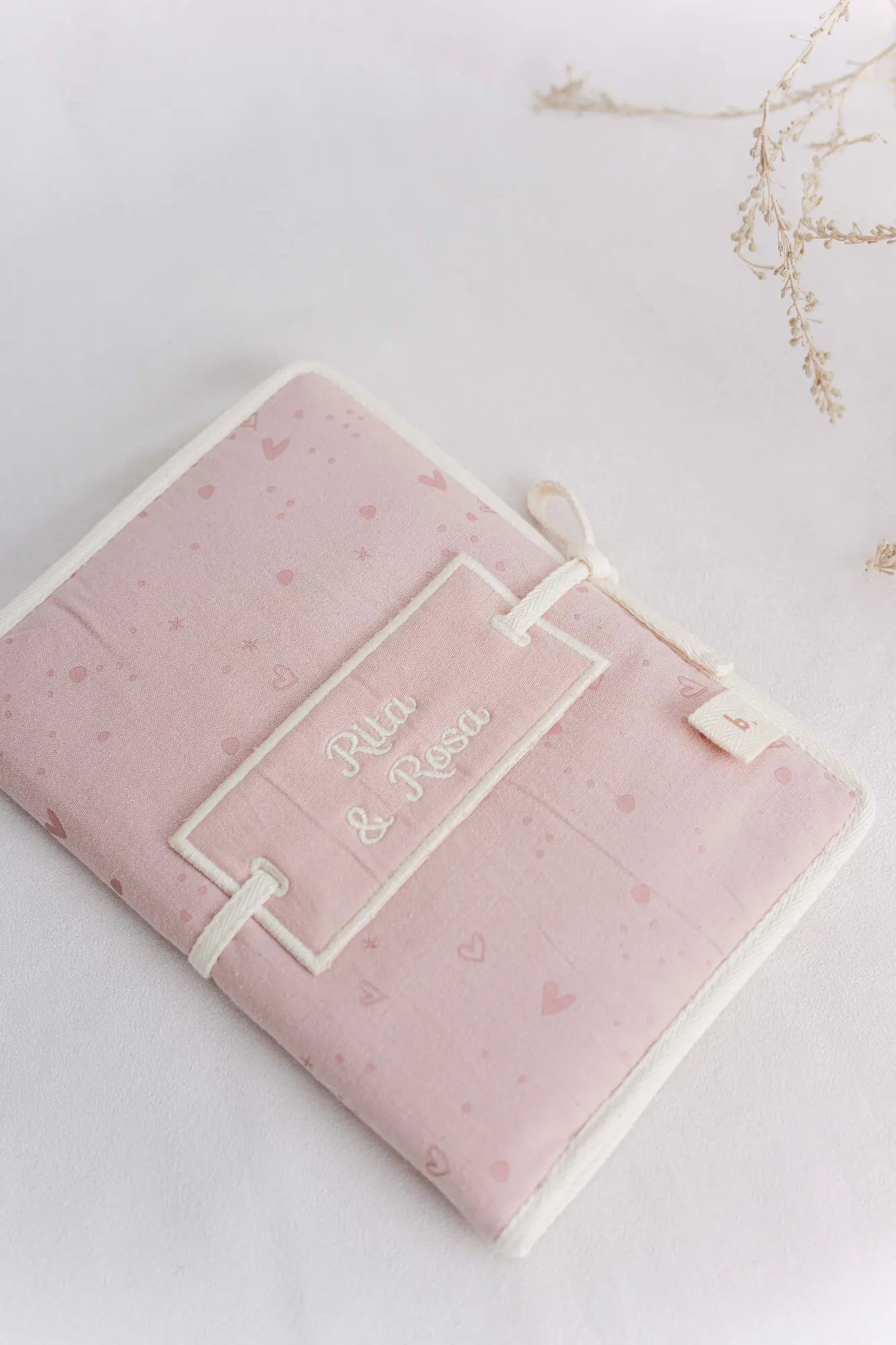 Porta-documentos en tela de algodón con estampas de estrellas y corazones.