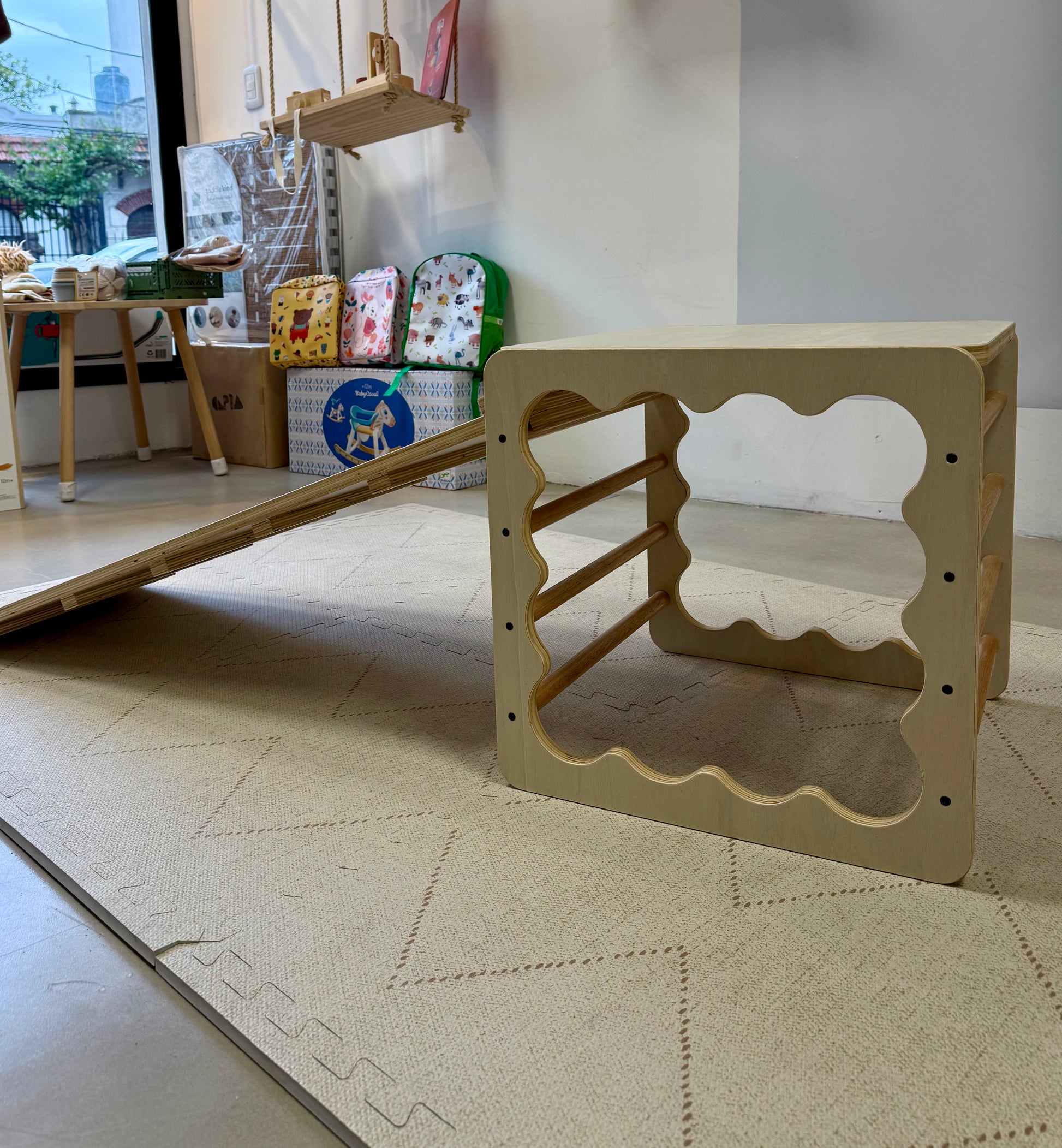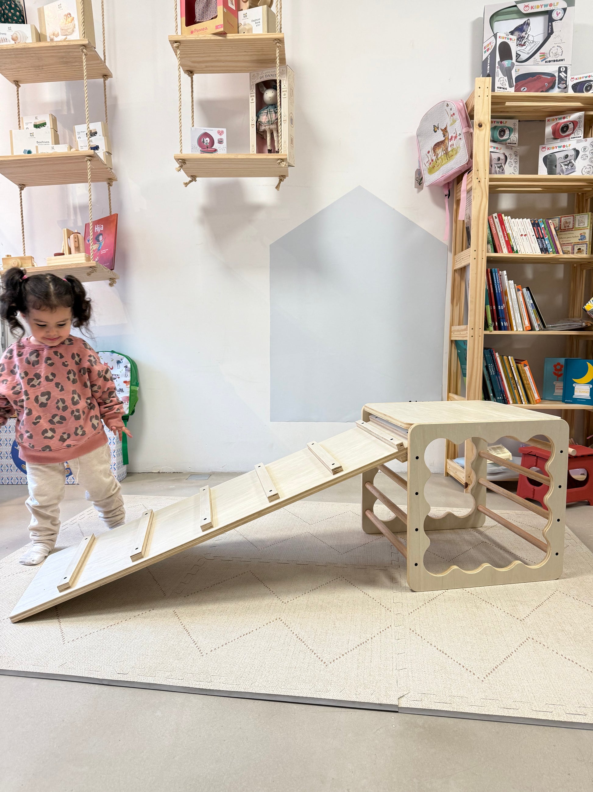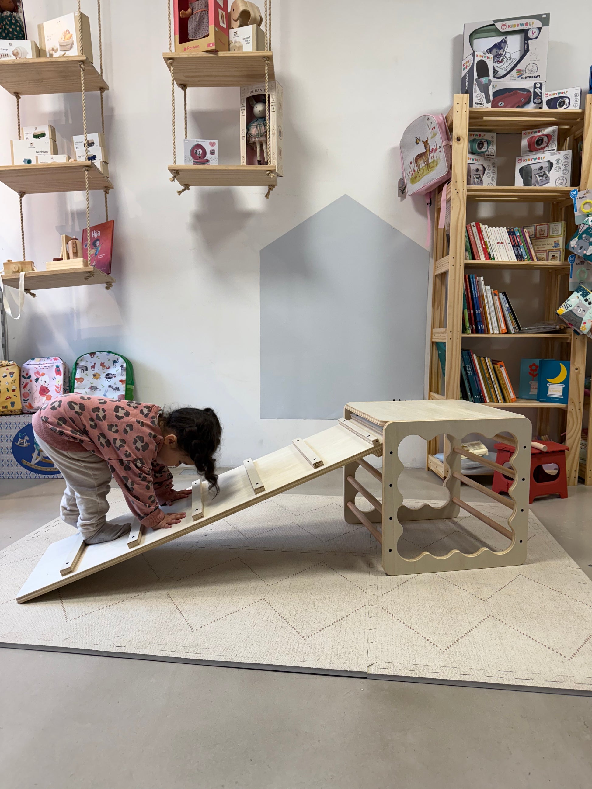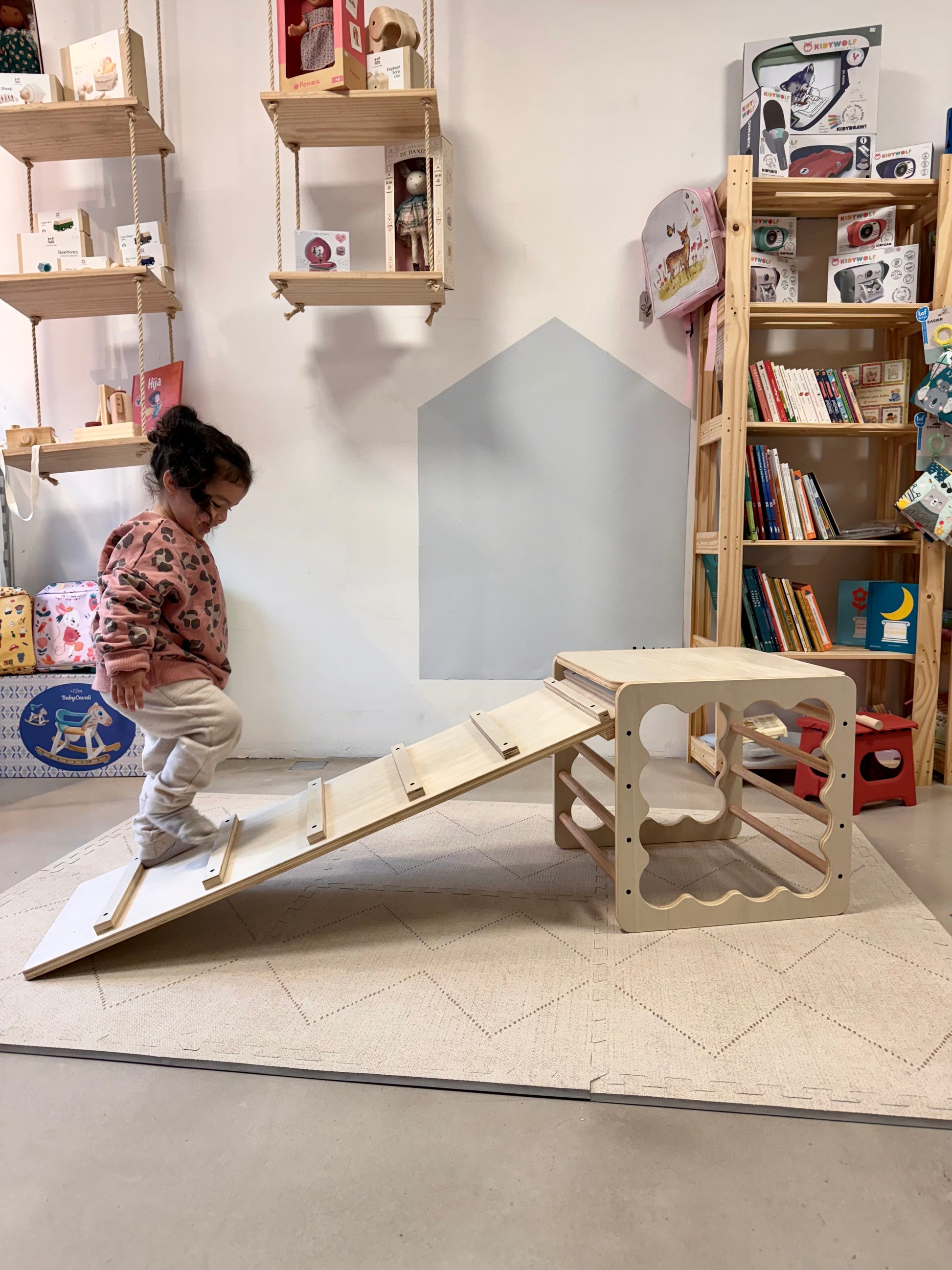 La rampa se combina con el Cubo o el Triángulo Pikler para formar toboganes, rampas de gateo o circuitos motrices completos. Es ideal para acompañar el desarrollo de la motricidad gruesa a través del juego.
