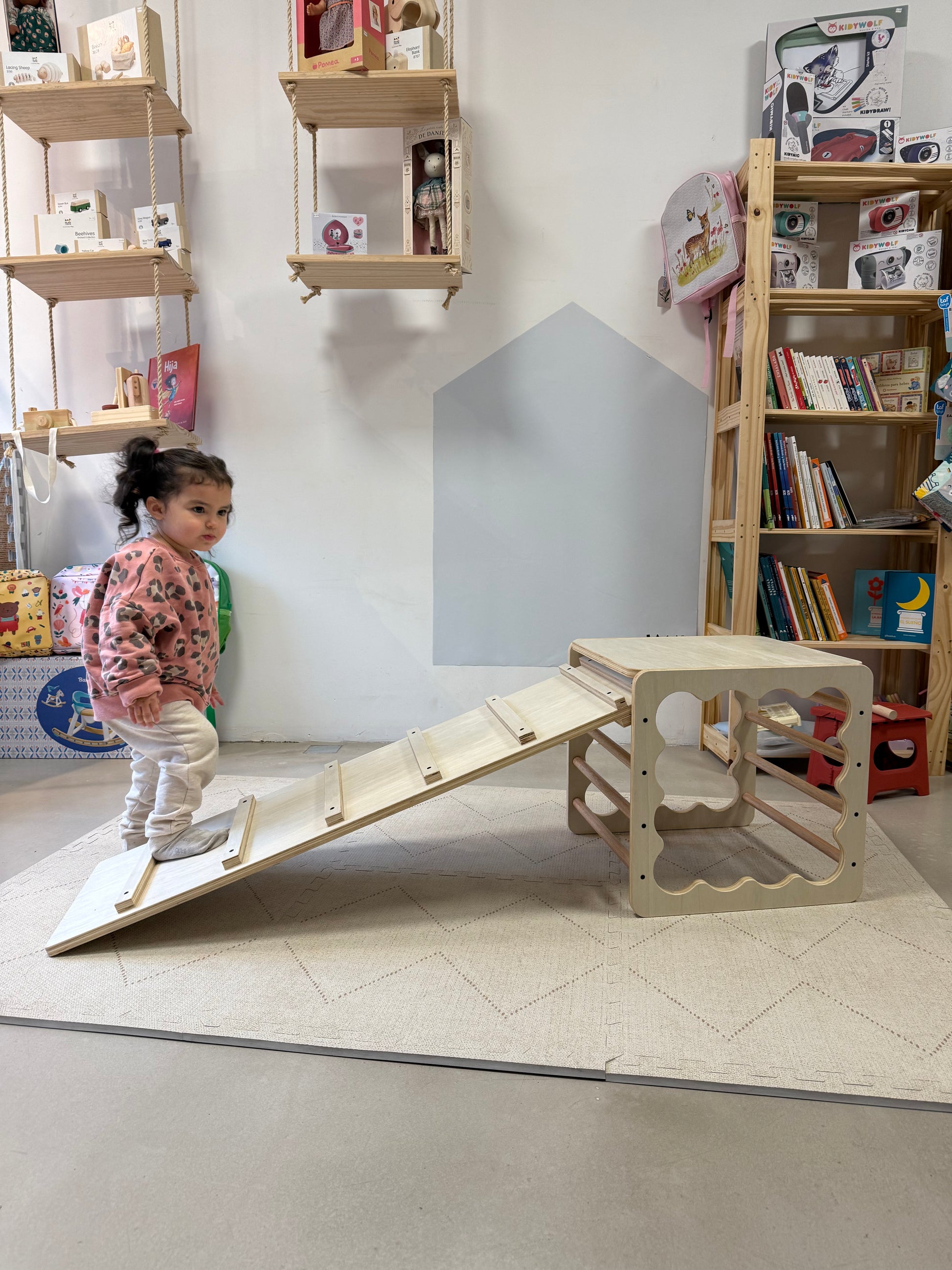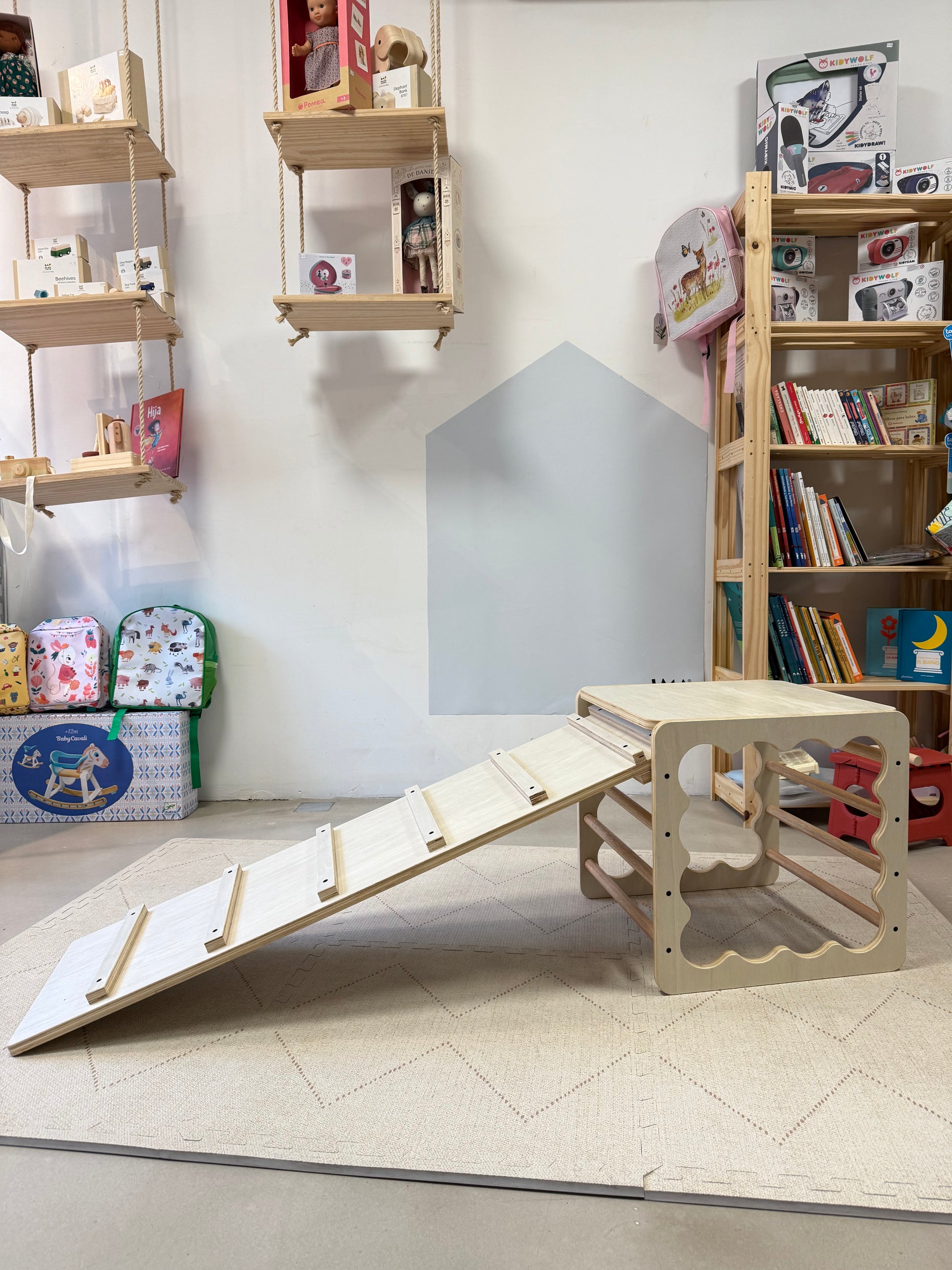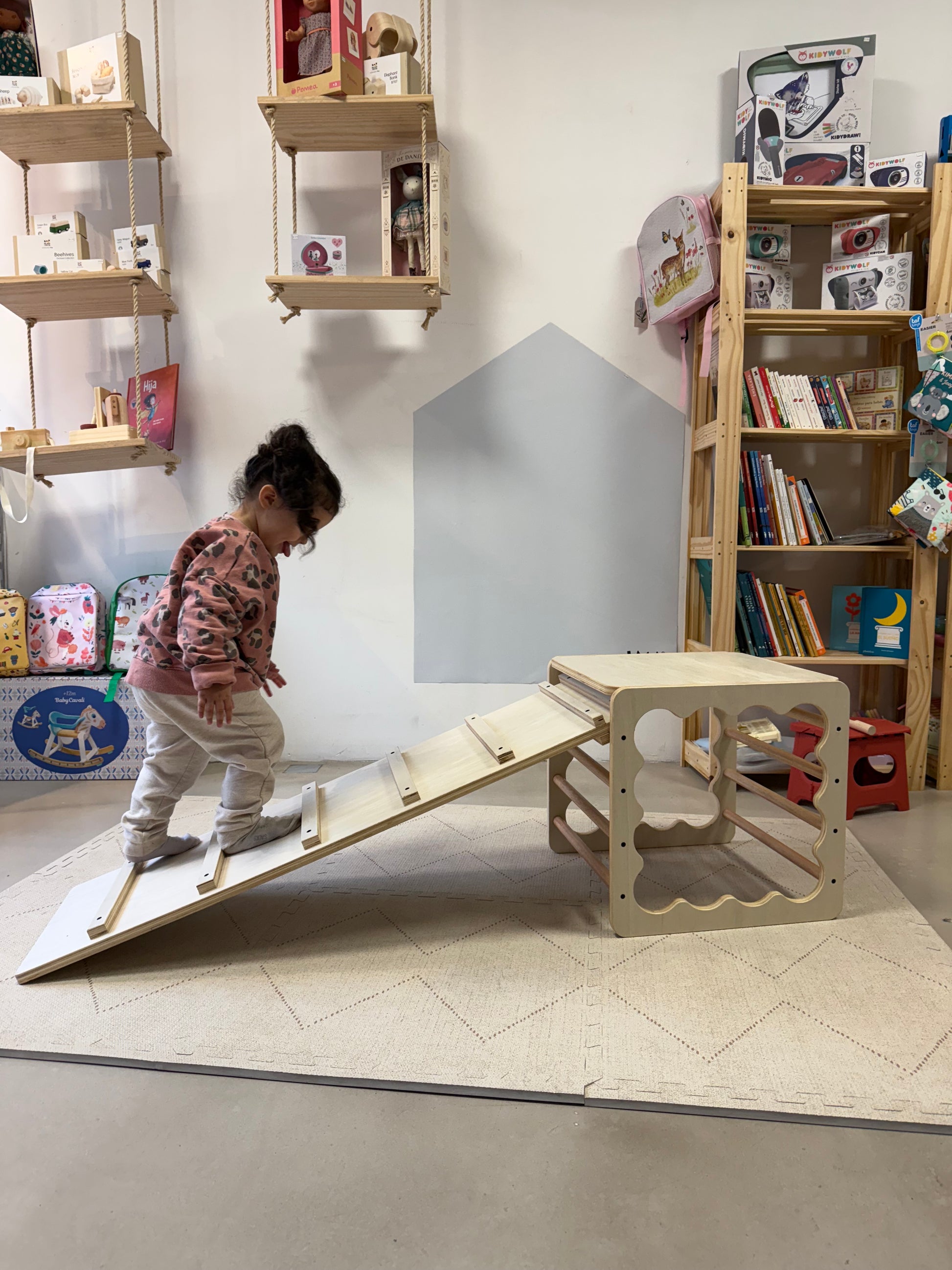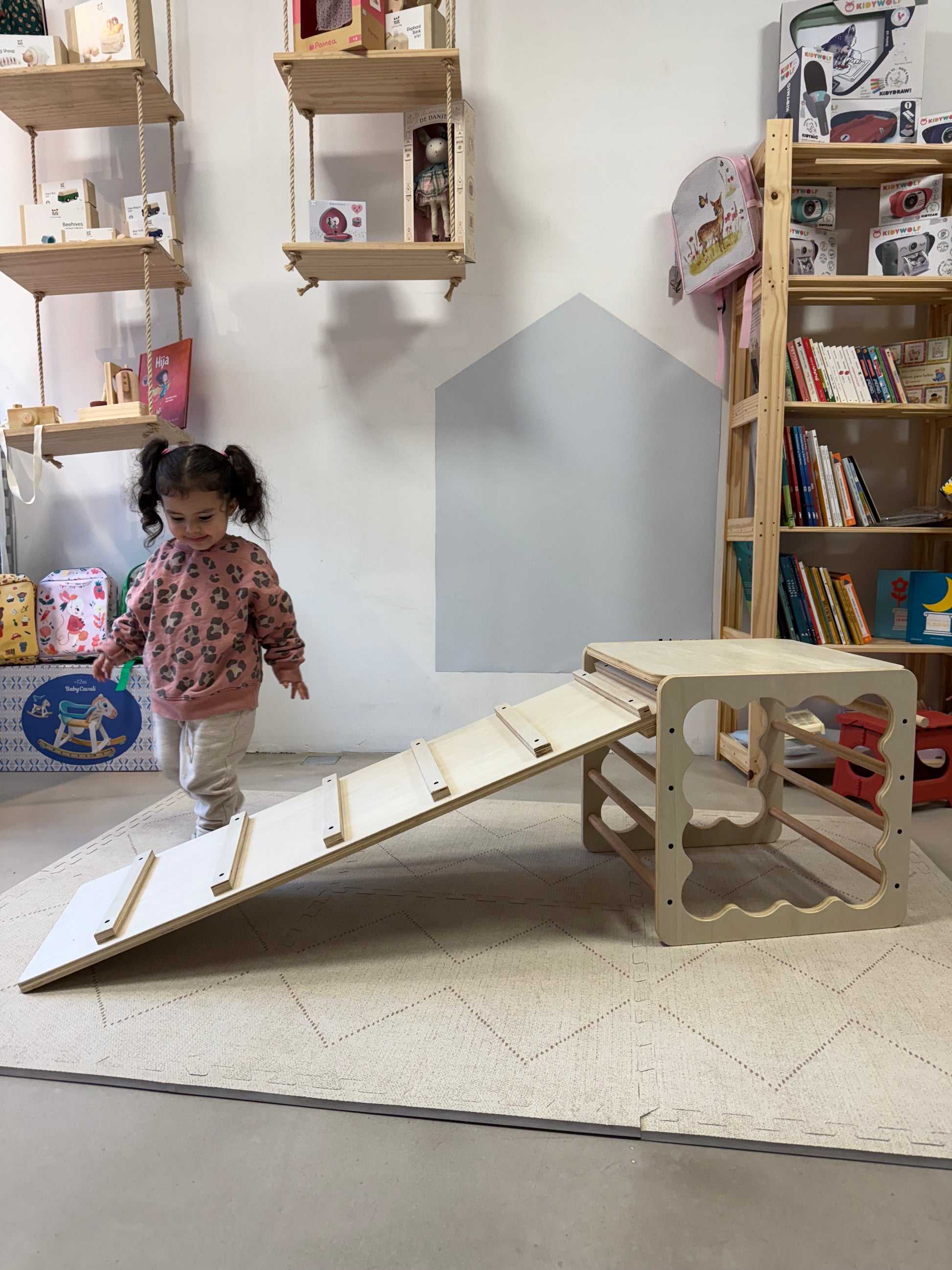 La rampa se combina con el Cubo o el Triángulo Pikler para formar toboganes, rampas de gateo o circuitos motrices completos. Es ideal para acompañar el desarrollo de la motricidad gruesa a través del juego.