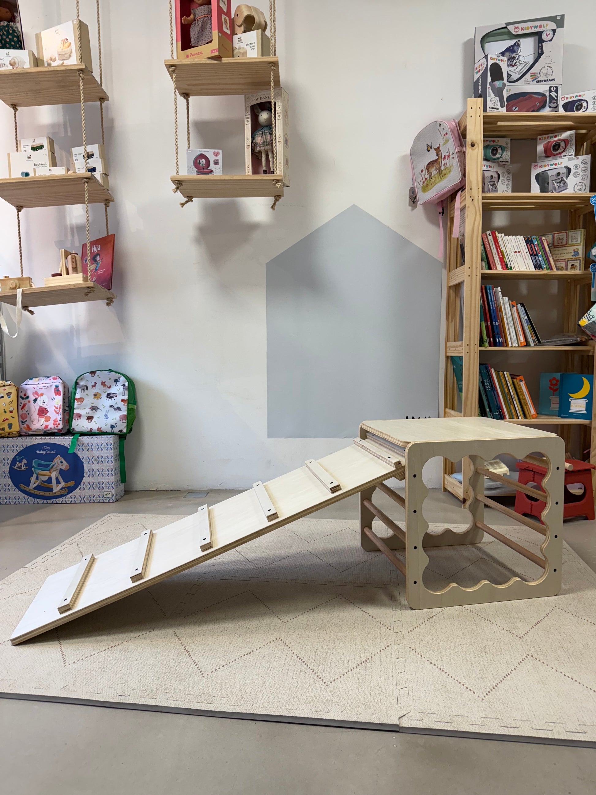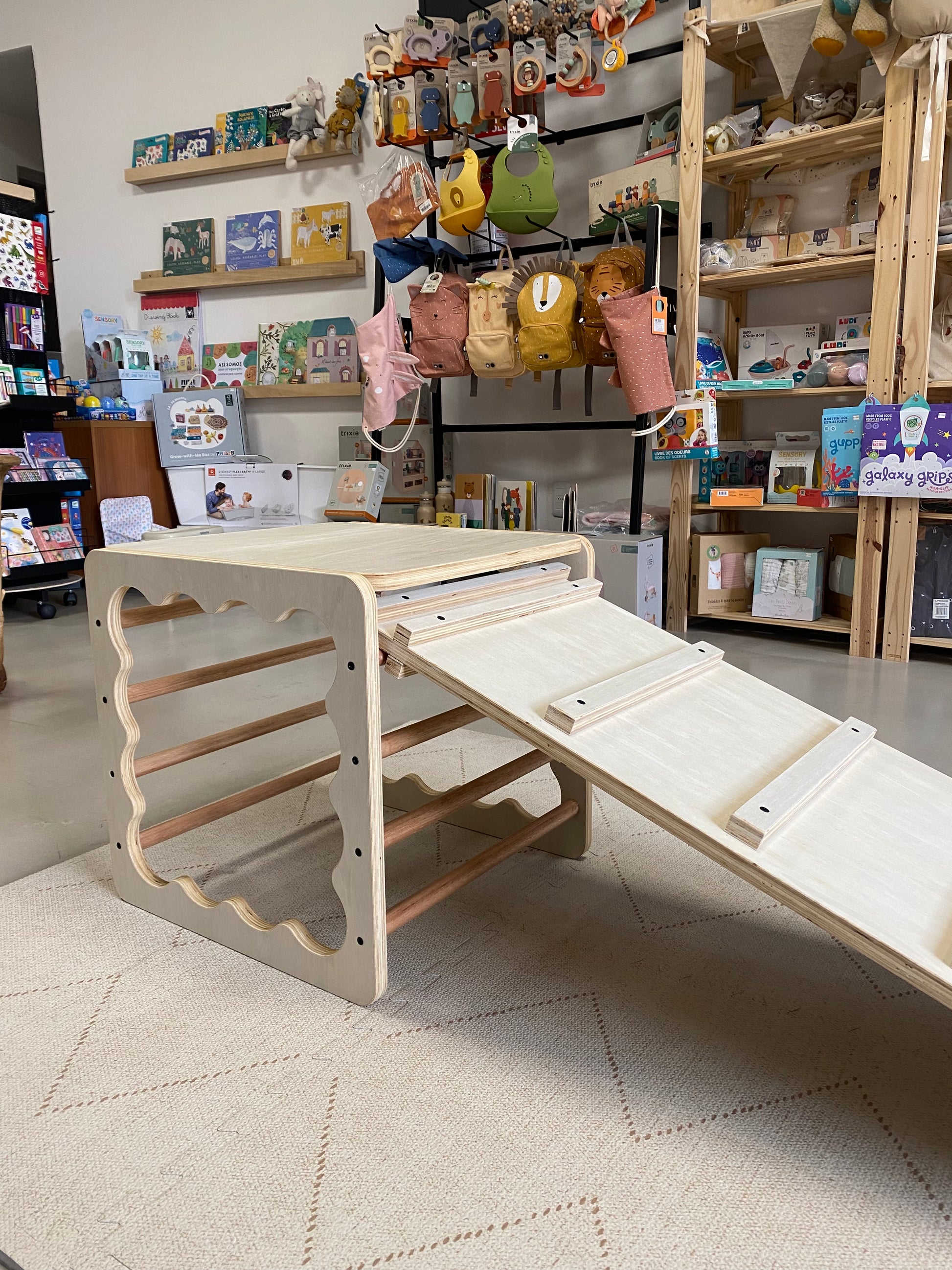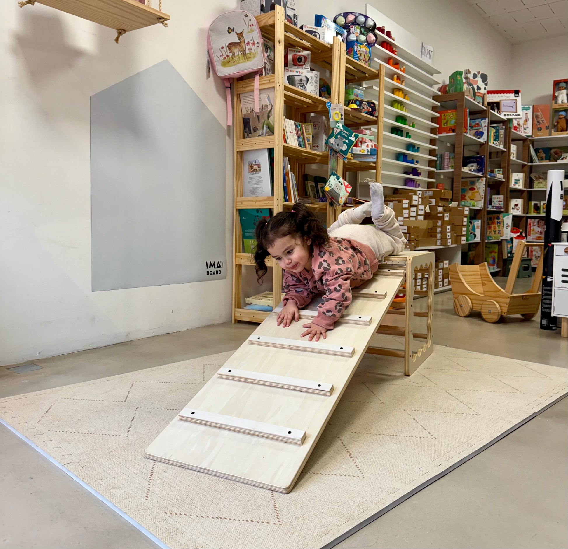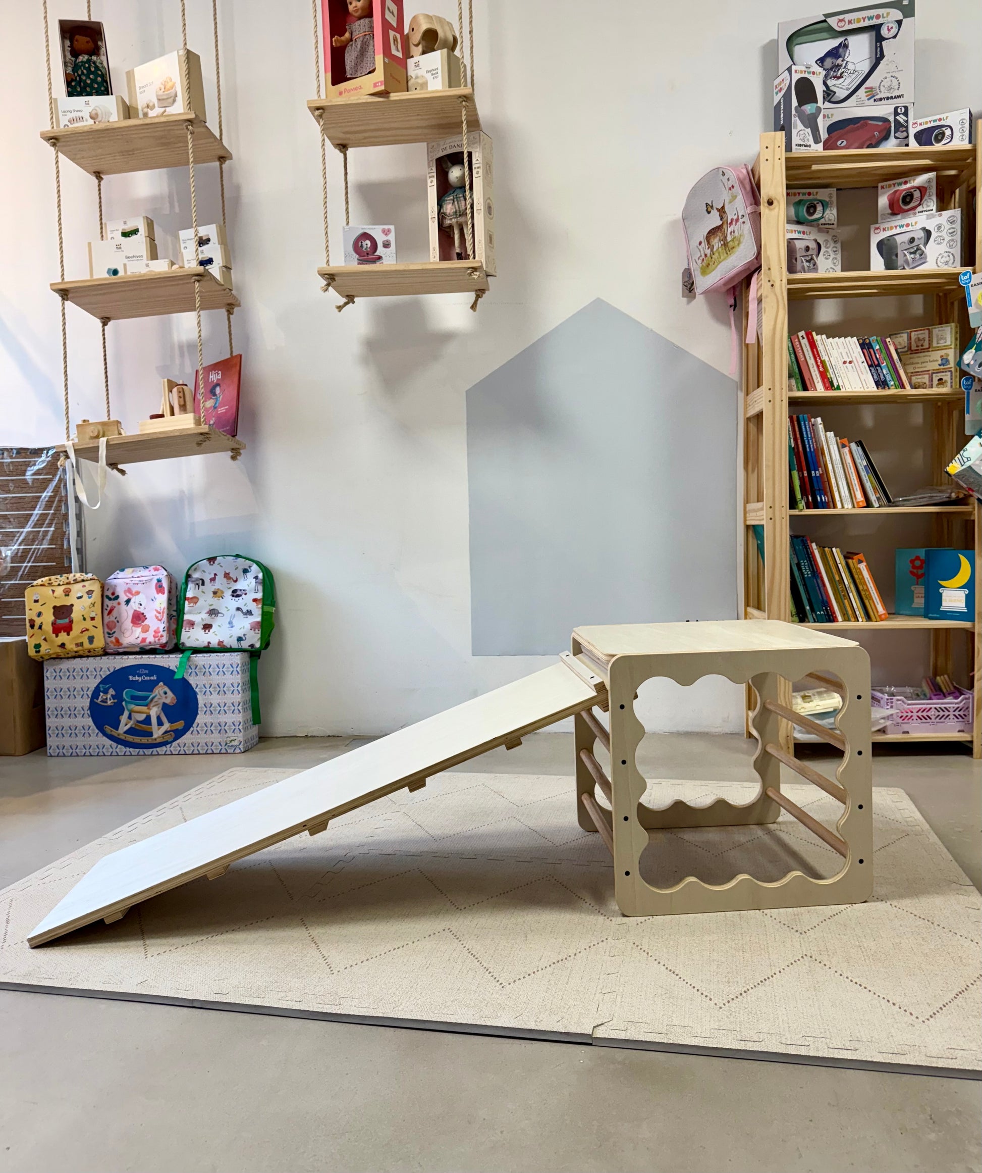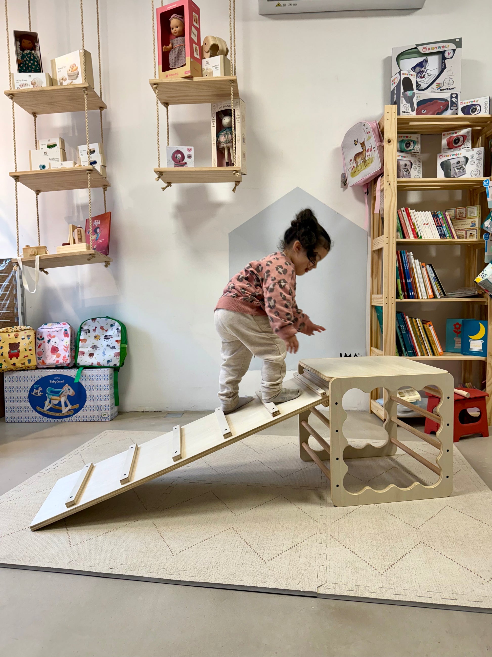 La rampa se combina con el Cubo o el Triángulo Pikler para formar toboganes, rampas de gateo o circuitos motrices completos. Es ideal para acompañar el desarrollo de la motricidad gruesa a través del juego.