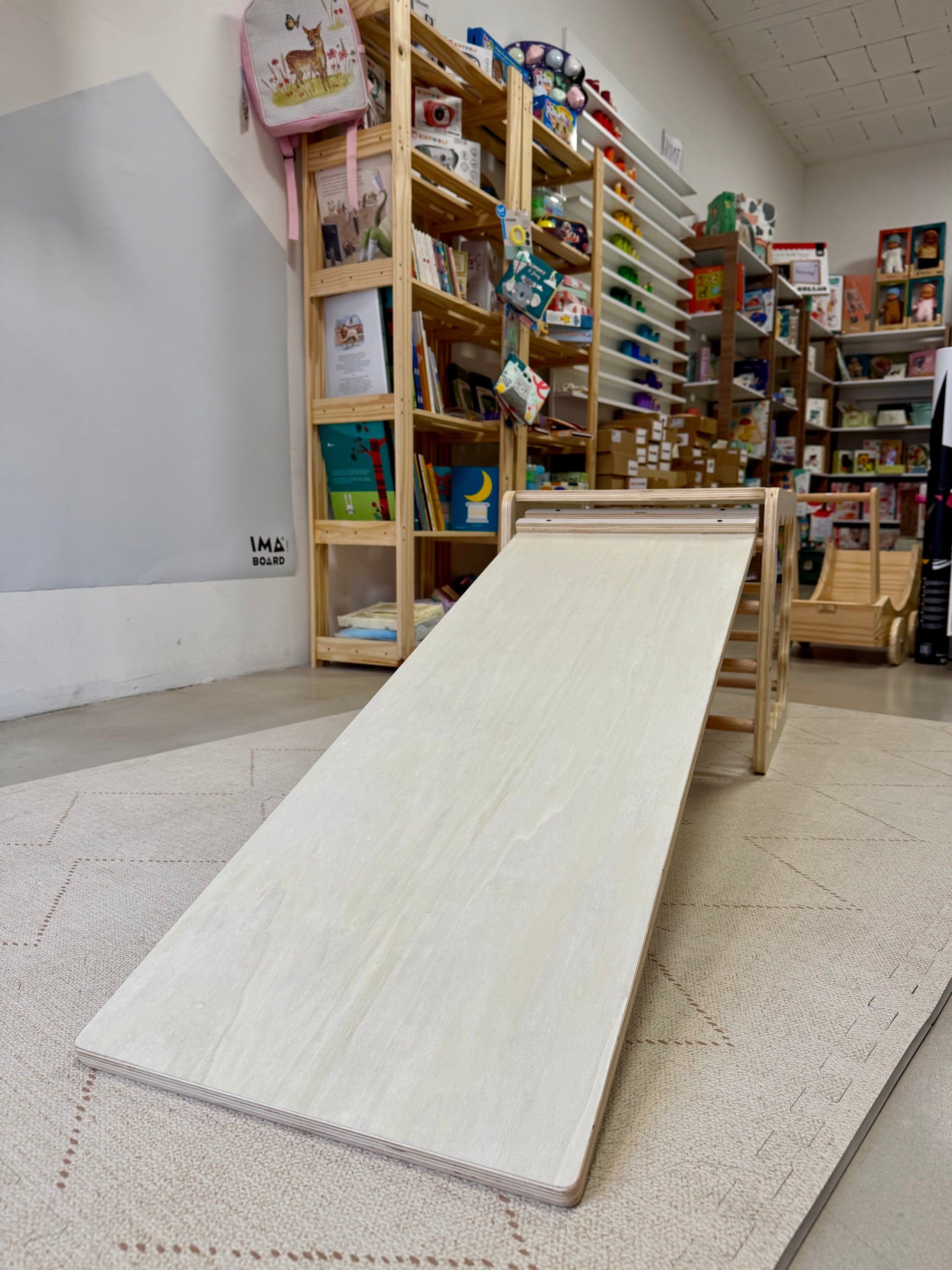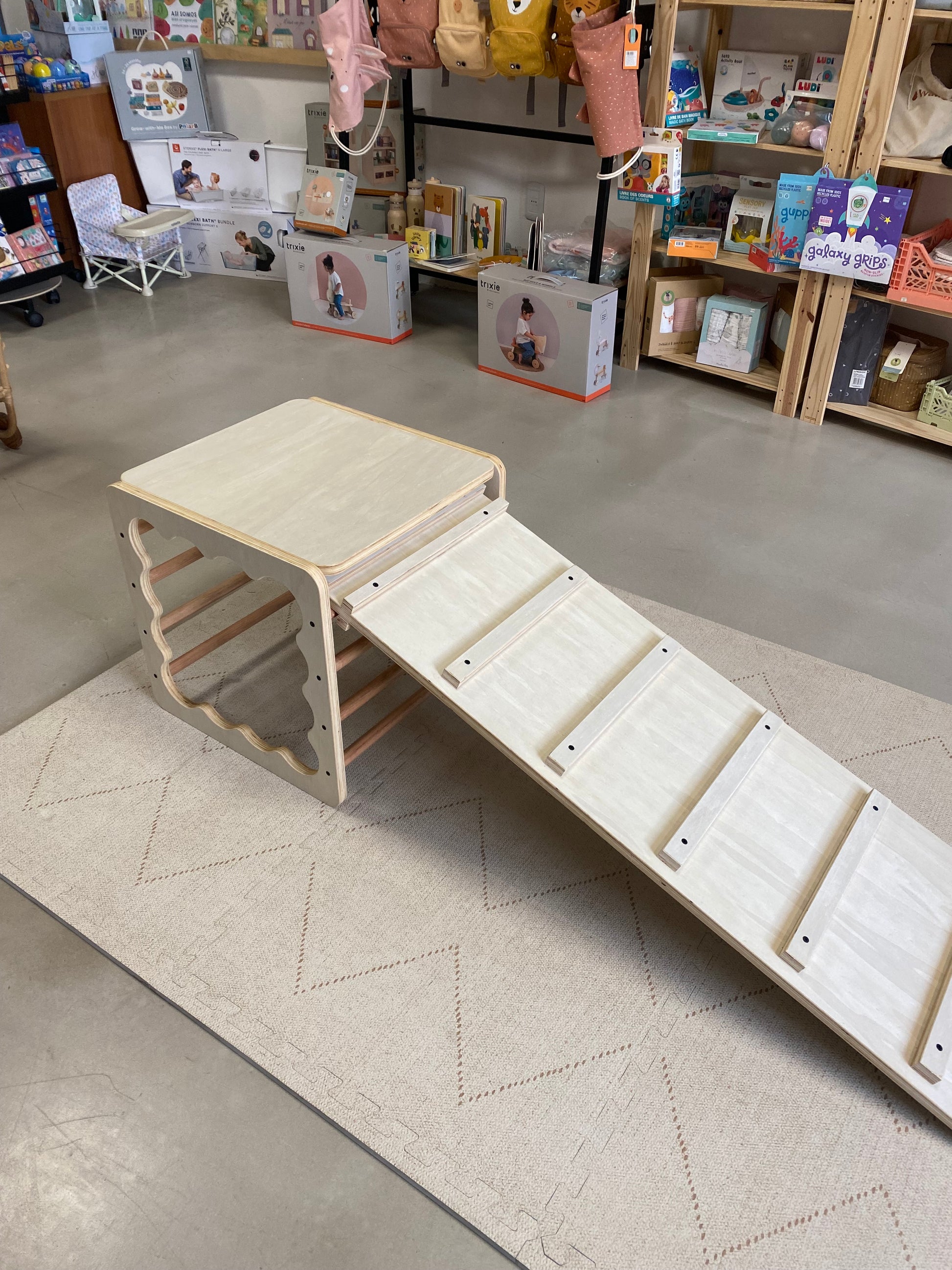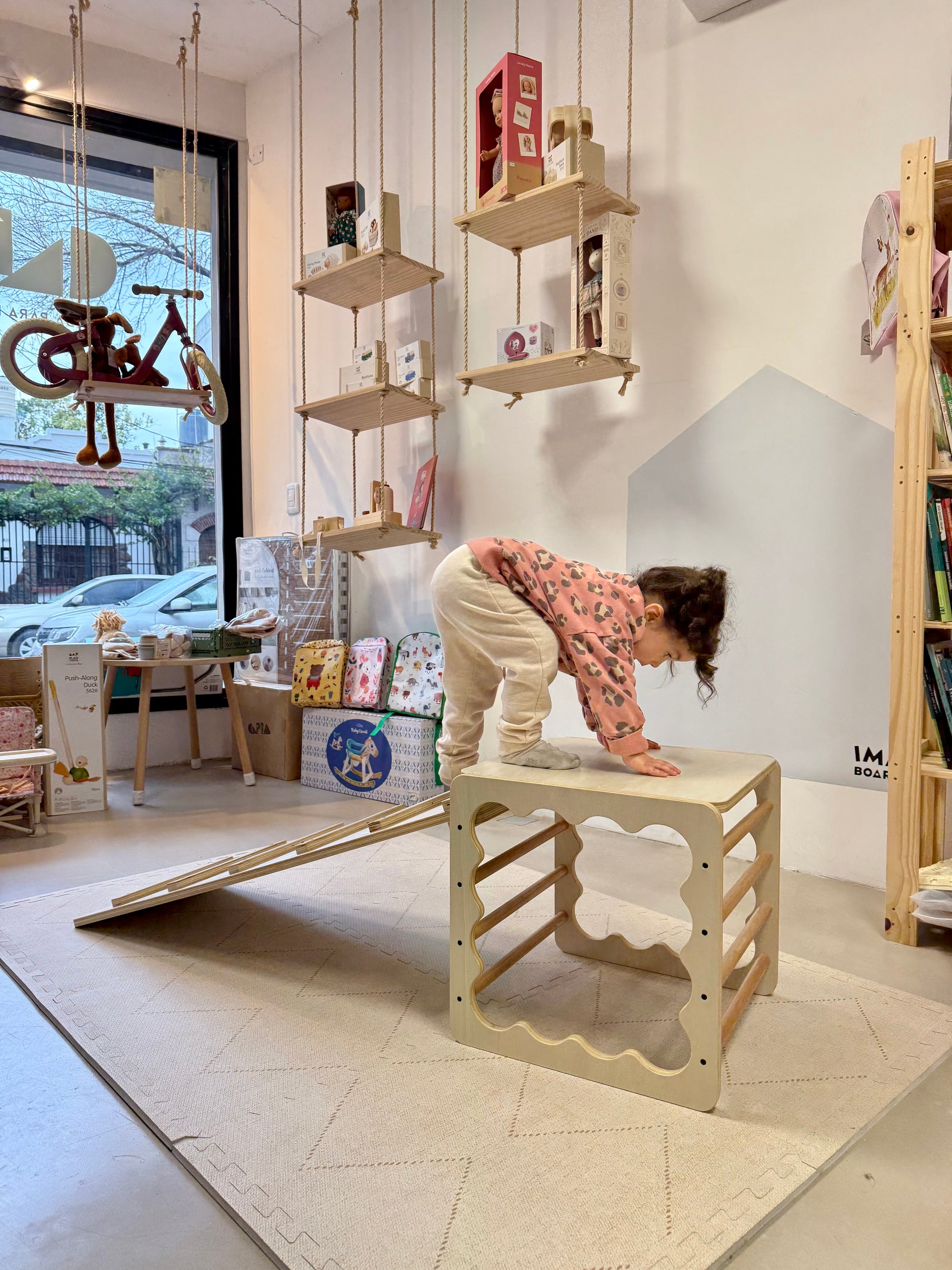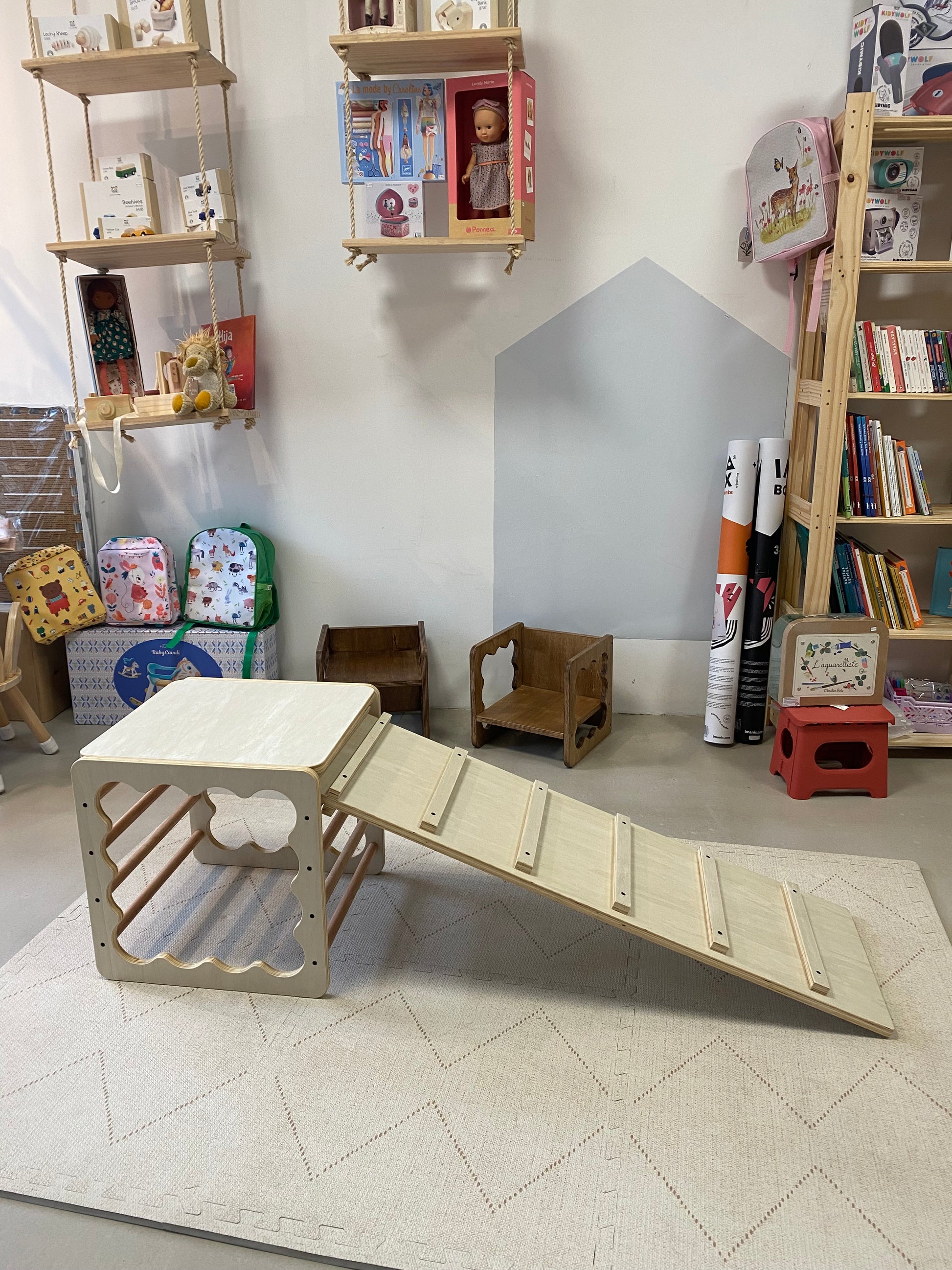 La rampa se combina con el Cubo o el Triángulo Pikler para formar toboganes, rampas de gateo o circuitos motrices completos. Es ideal para acompañar el desarrollo de la motricidad gruesa a través del juego.