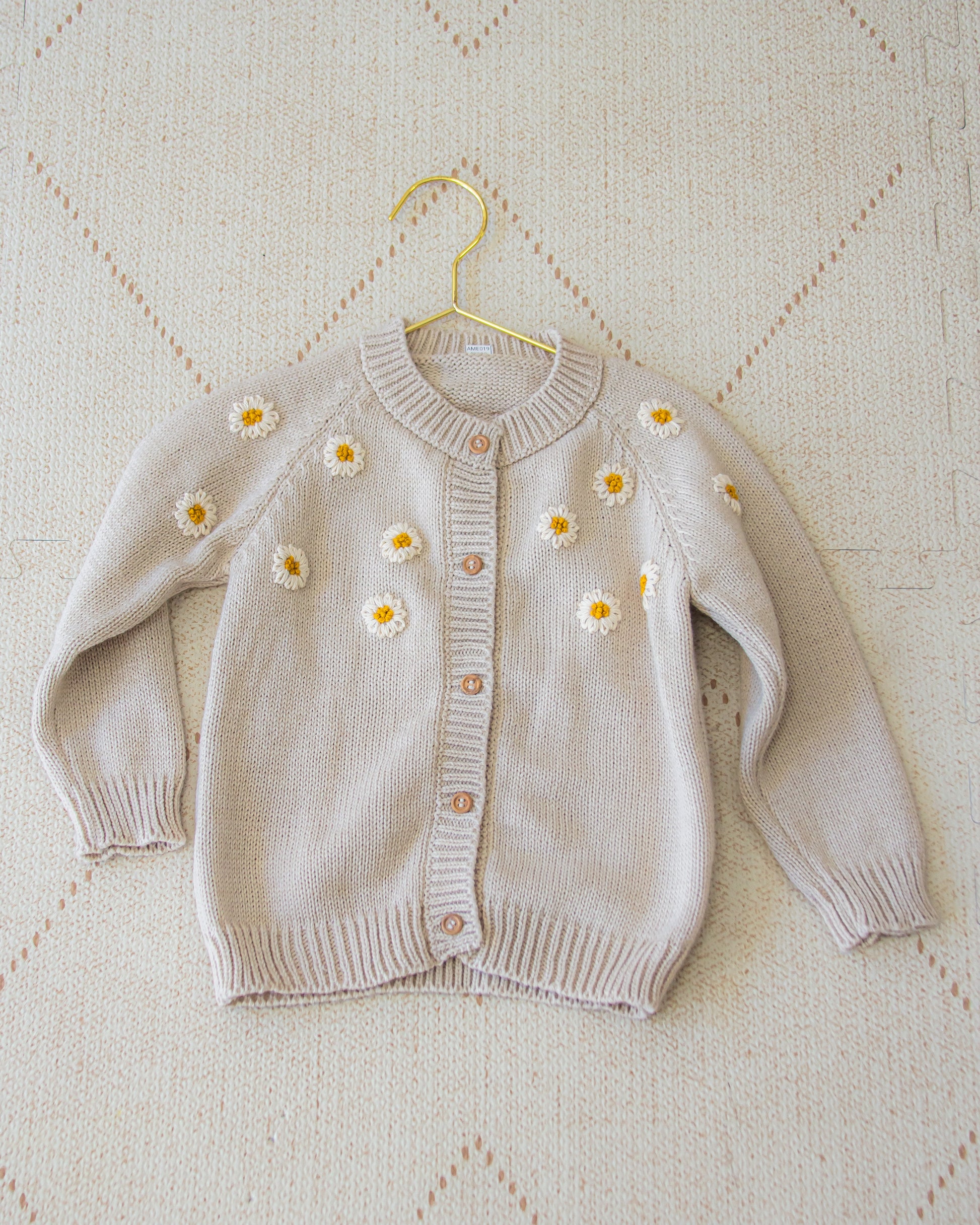 Saco tejido con margaritas bordadas a mano.