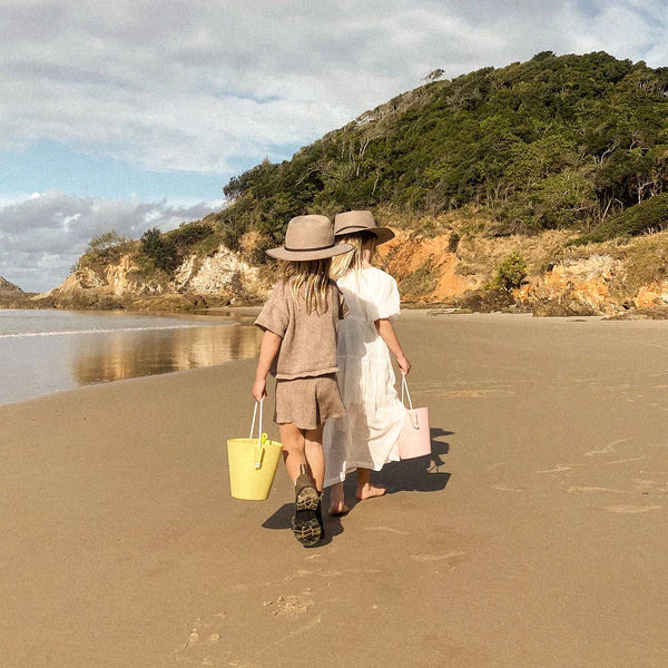 Incluye un balde con manija de cuerda, una pala y 3 moldes: frutilla, helado y sandía.