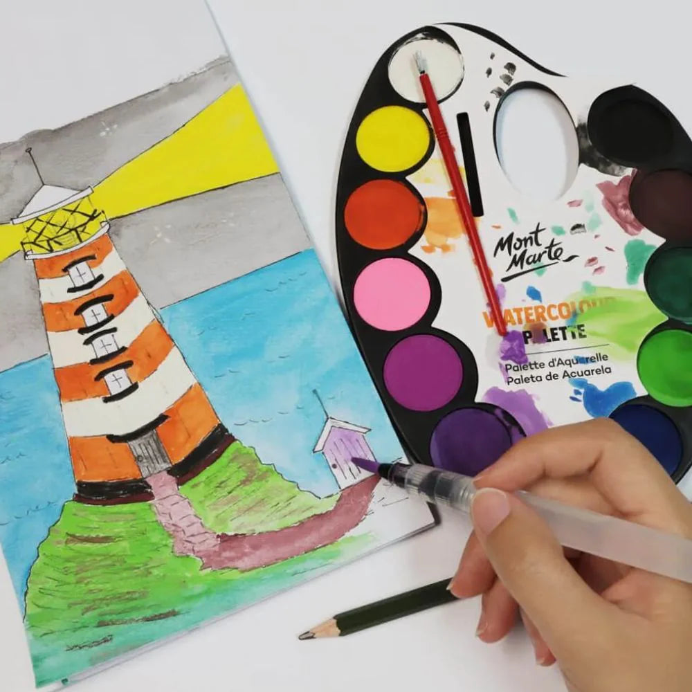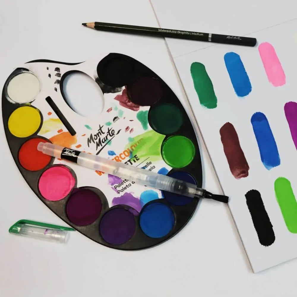 Permite que tu pequeño artista se sumerja en el mundo de la acuarela con nuestro el set de acuarelas de 16 piezas de Mont Marte.
