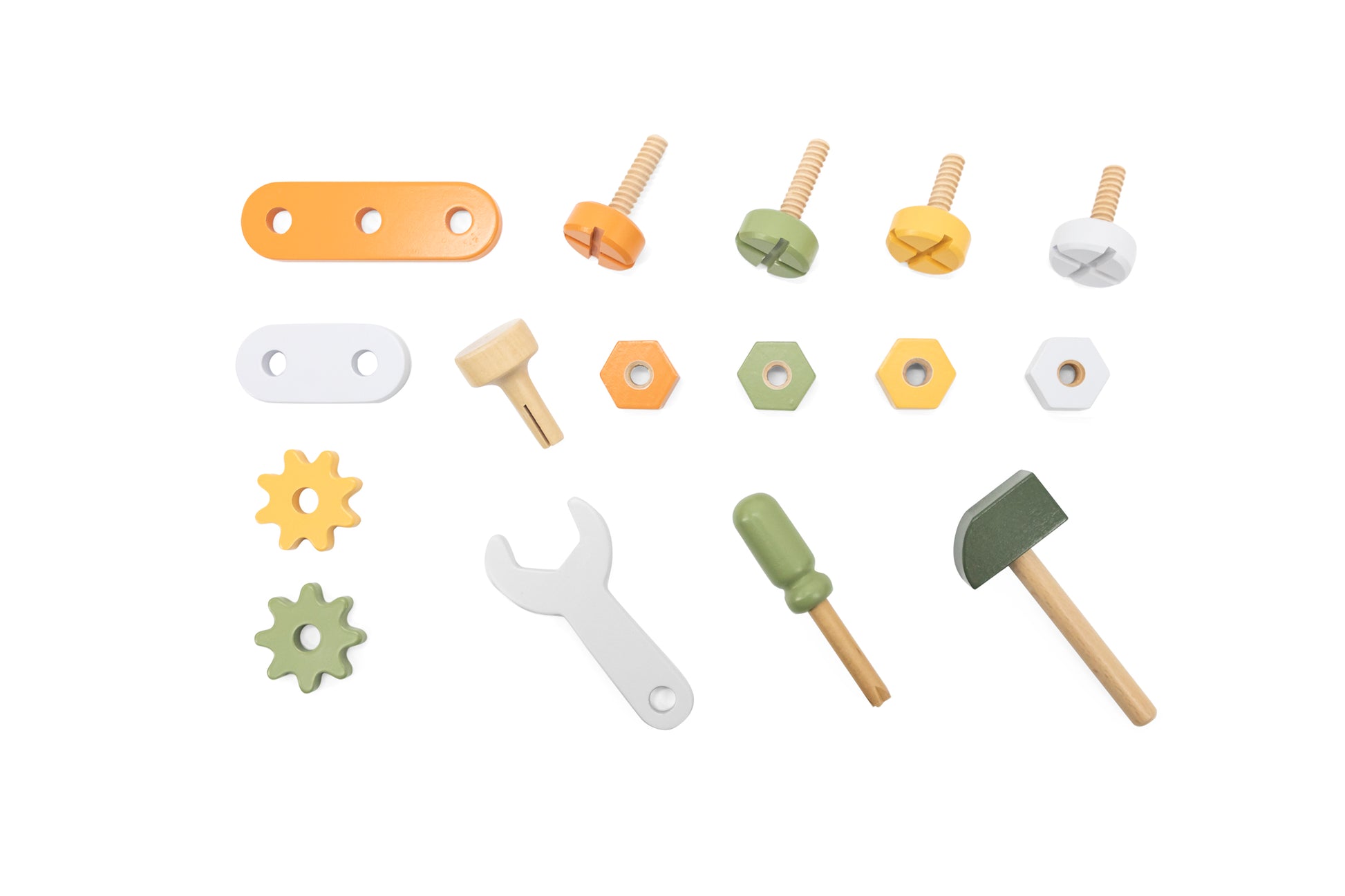 Un juego que invita a imaginar, construir y explorar con las manos. Este set de herramientas de madera en suaves tonos verde pastel es ideal para niños a partir de los 3 años que disfrutan del juego simbólico y de experimentar con el mundo que los rodea.