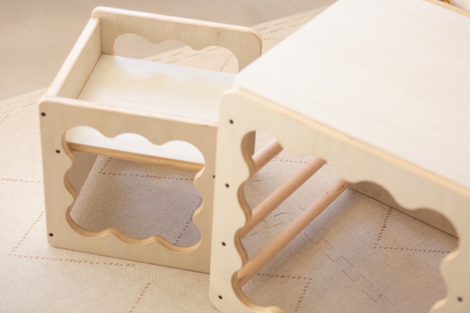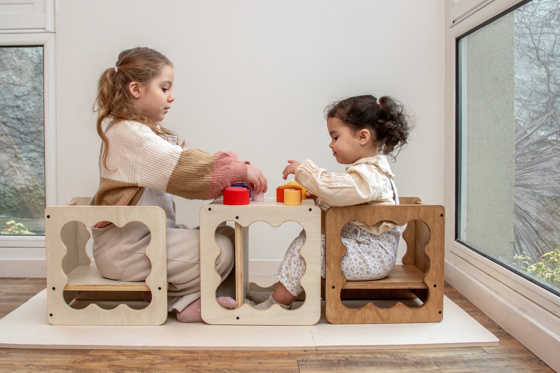 Al ofrecer distintas alturas, tener estructura firme y bordes redondeados que brindan seguridad, permite que los peques se sienten y se levanten solos, evitando caídas y favoreciendo su autonomía desde temprano.