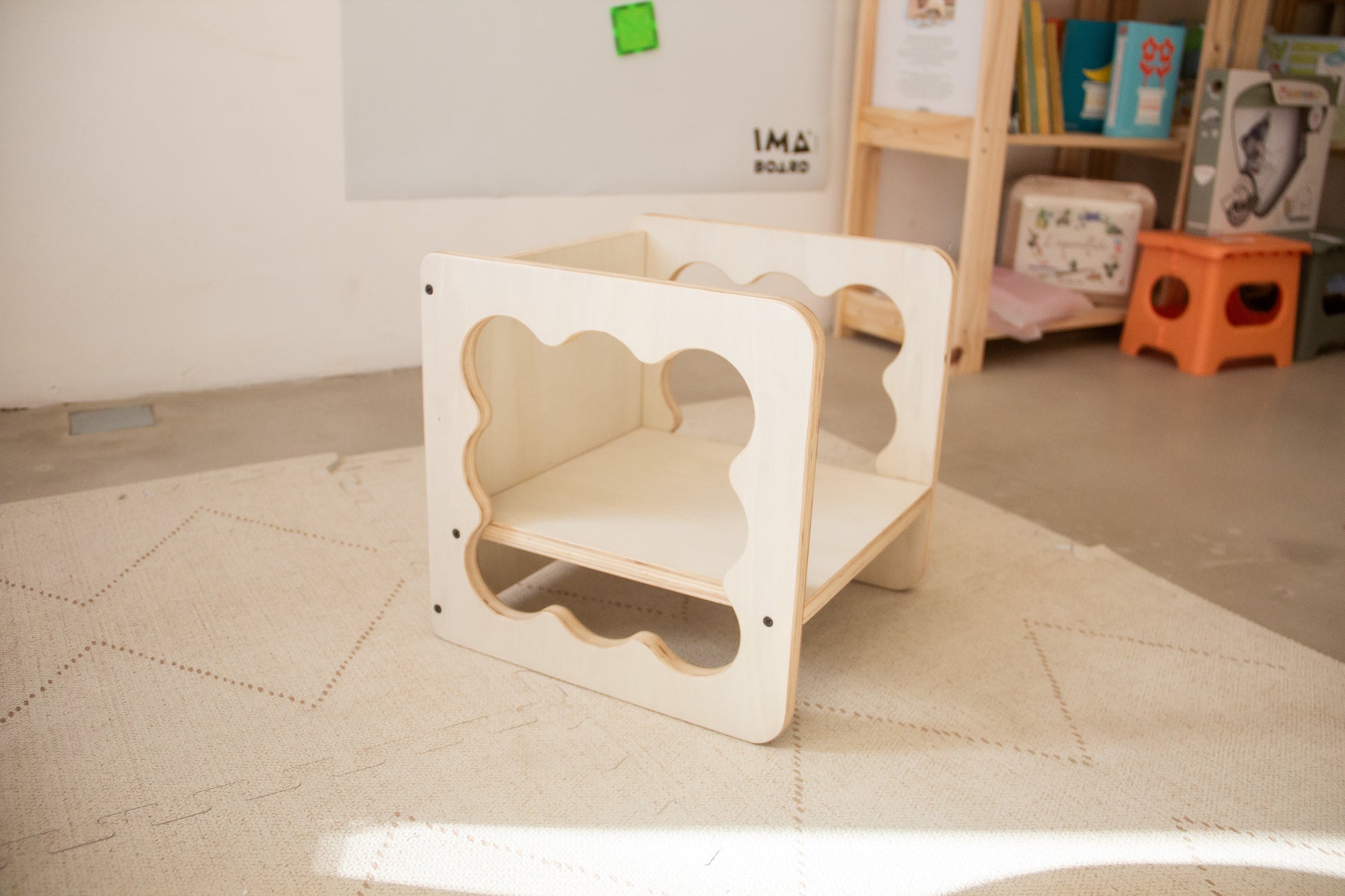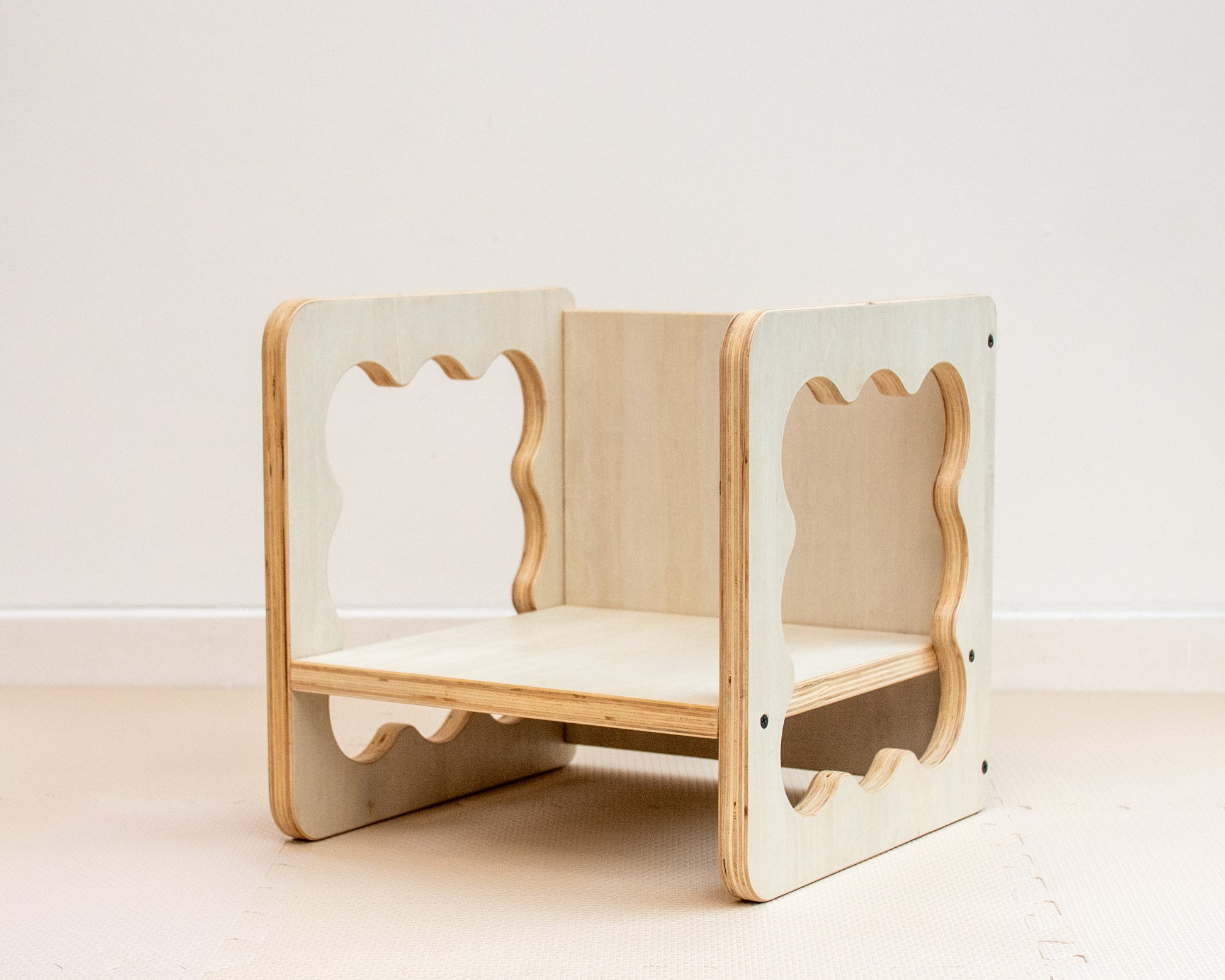 Gracias a su diseño cúbico, se puede girar para ofrecer dos alturas de asiento. Más adelante, también puede usarse como banco, acompañando distintas etapas del crecimiento.
