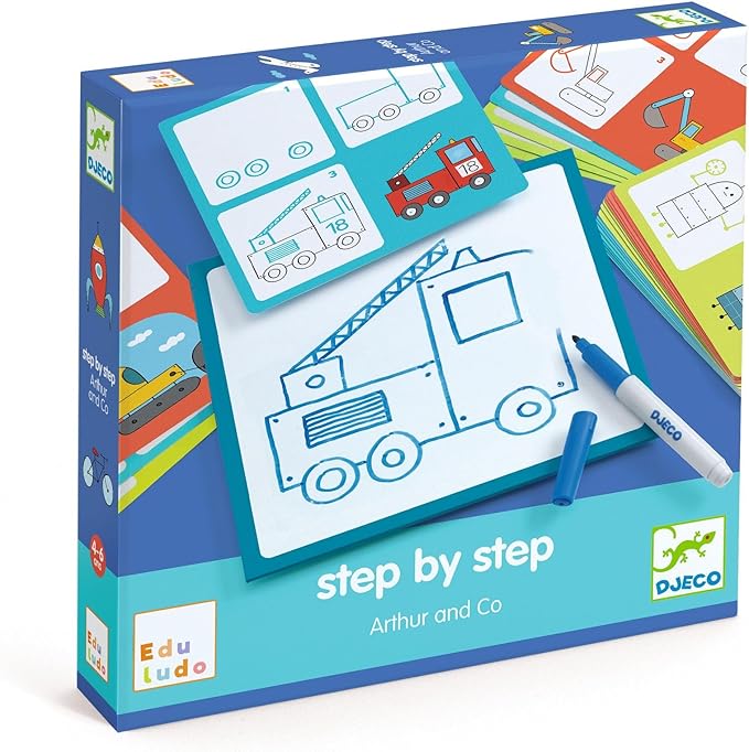 Este juego incluye 12 tarjetas de doble cara, con el paso a paso para lograr los dibujos, 1 tabla borrable donde dibujar, 1 marcado y 1 borrador.