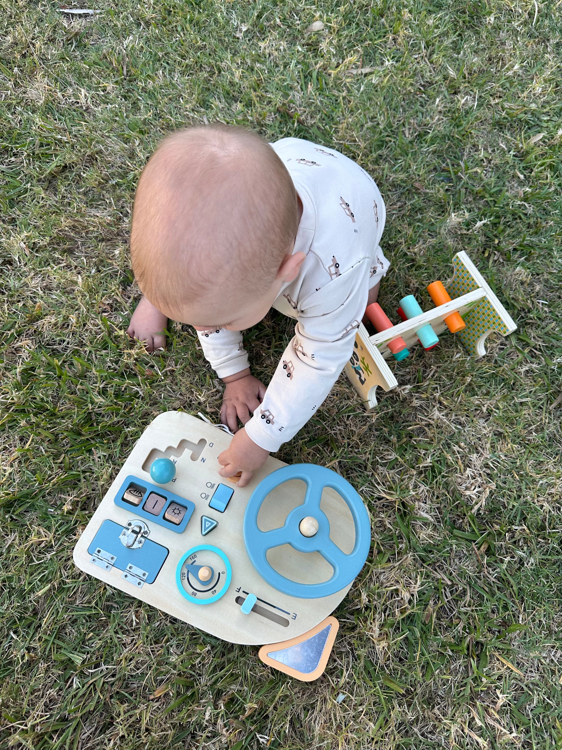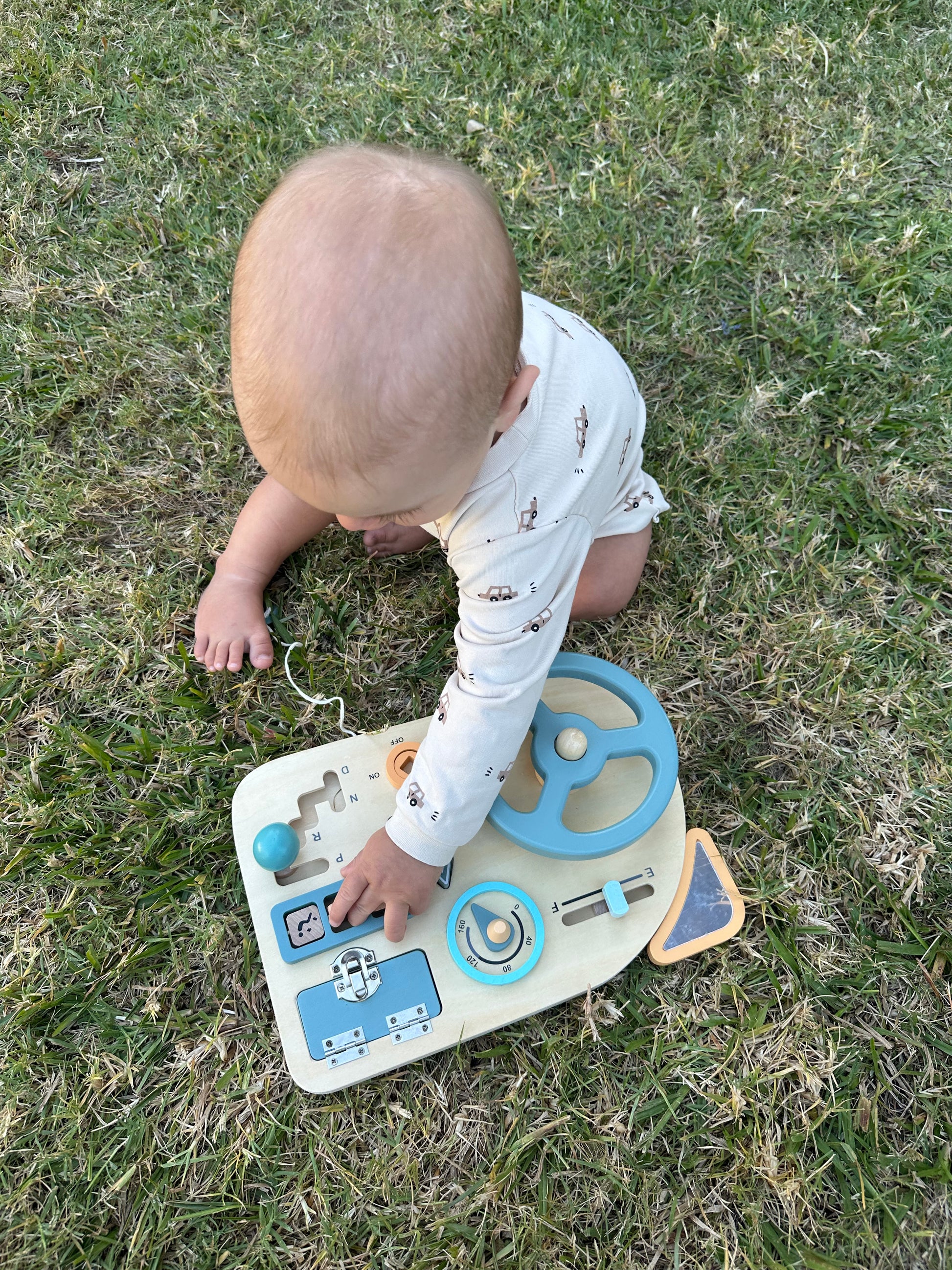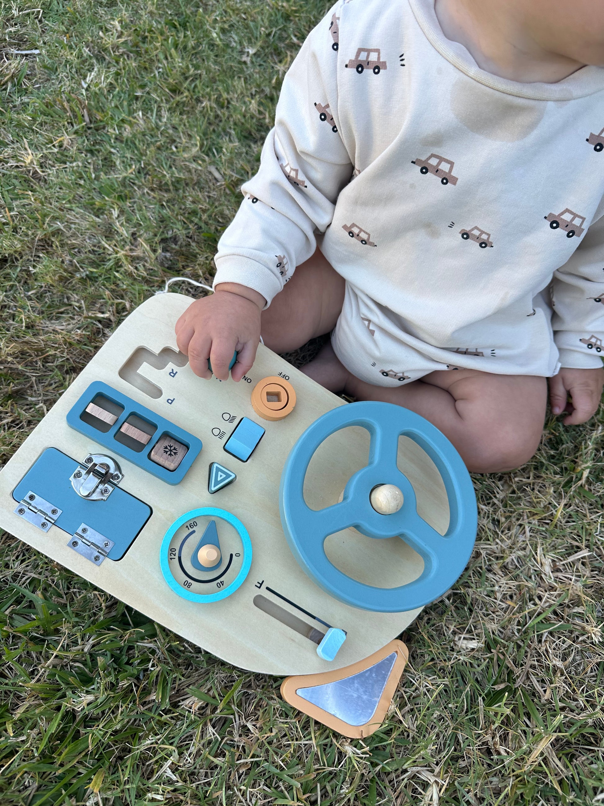 Panel sensorial con temática de automóvil. El panel simula el tablero de un auto, con mecanismos de encendido, palanca de cambios, marcador de velocidad y llave con la cual simular el encendido.