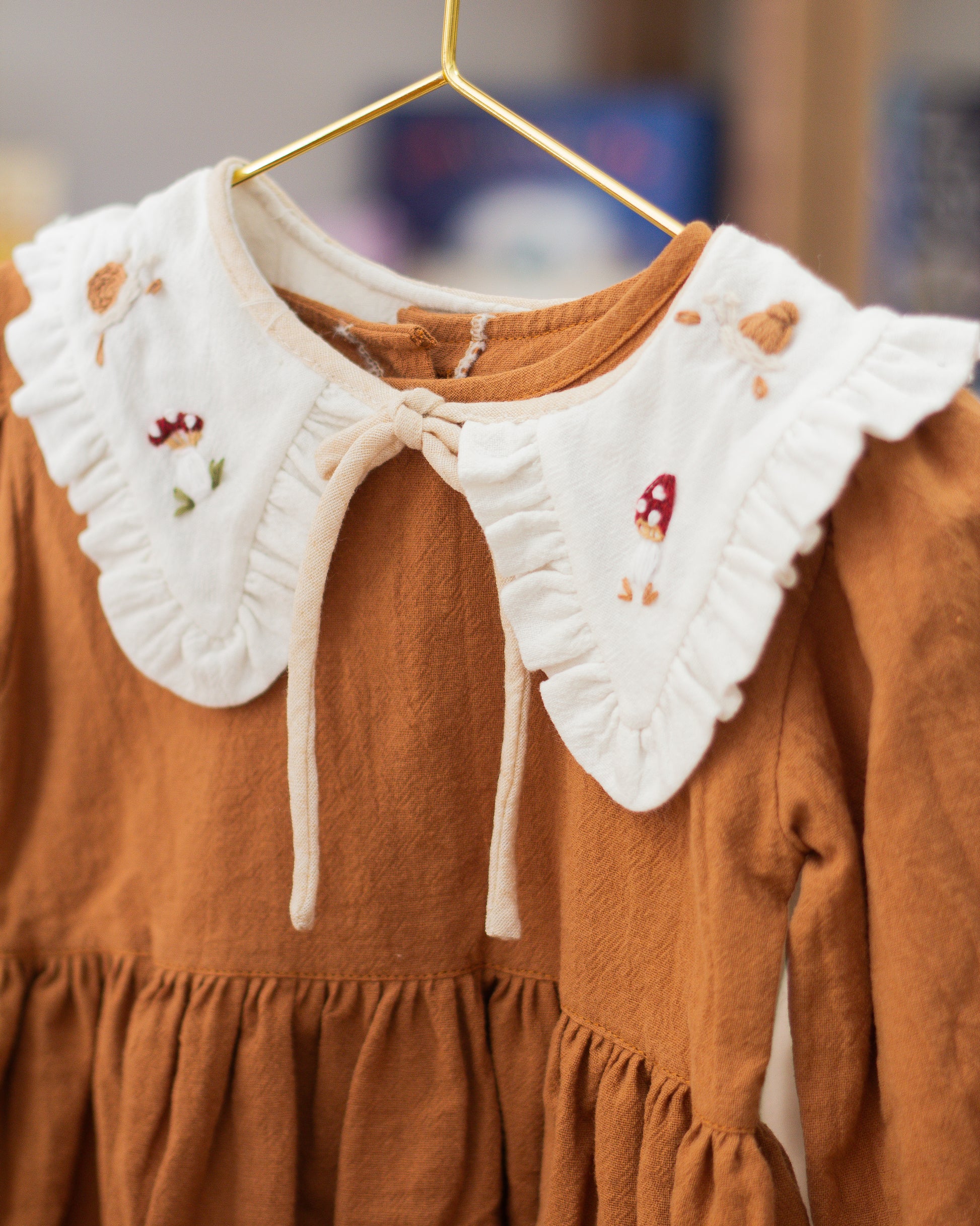 Vestido en color tostado con cuello desmontable. Bordado a mano con detalles campestres
